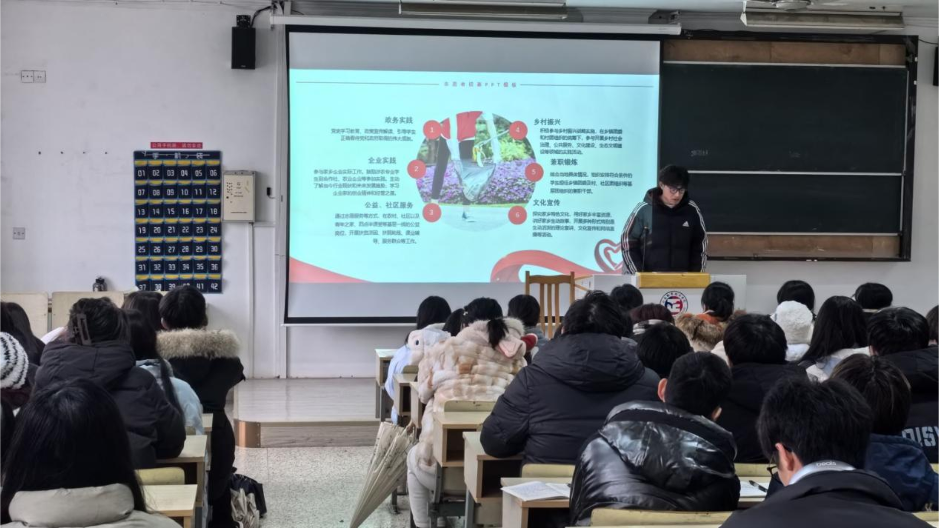 在第一项议程中,虞骏卿指出了参与社会实践对大学生提升能力、奉献社会以及实现人生价值等方面的重要意义,并例举多种社会实践形式,呼吁同学们利用寒假走出家门、了解社会、了解国情。同时他强调,大学生应增强社会责任感和使命感,勇于创新,加强自身德、智、体、美、劳全面发展。