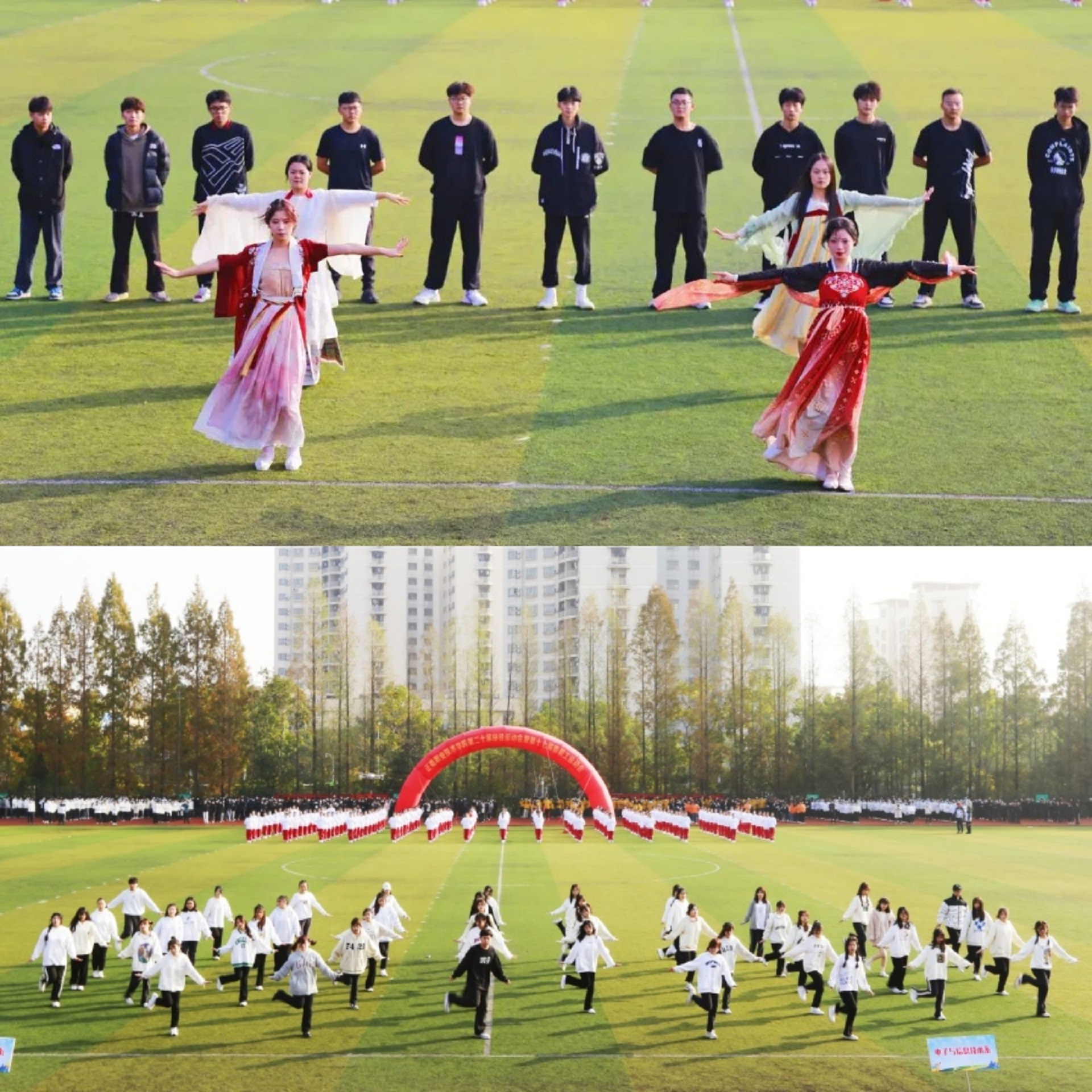 汽车与机电工程系带来了气势磅礴的军体拳表演;经济与管理系的动感十足的啦啦操表演,展示出大学生的青春活力;《我们都是追梦人》是基础教育系同学们献给全院师生又一场视觉盛宴,280余名同学身着盛装,手持花球伴随着音乐的旋律,激情飞扬,成为新时代下梦想的铸造者。接着,800名师生代表举行了第九套广播体操比赛。