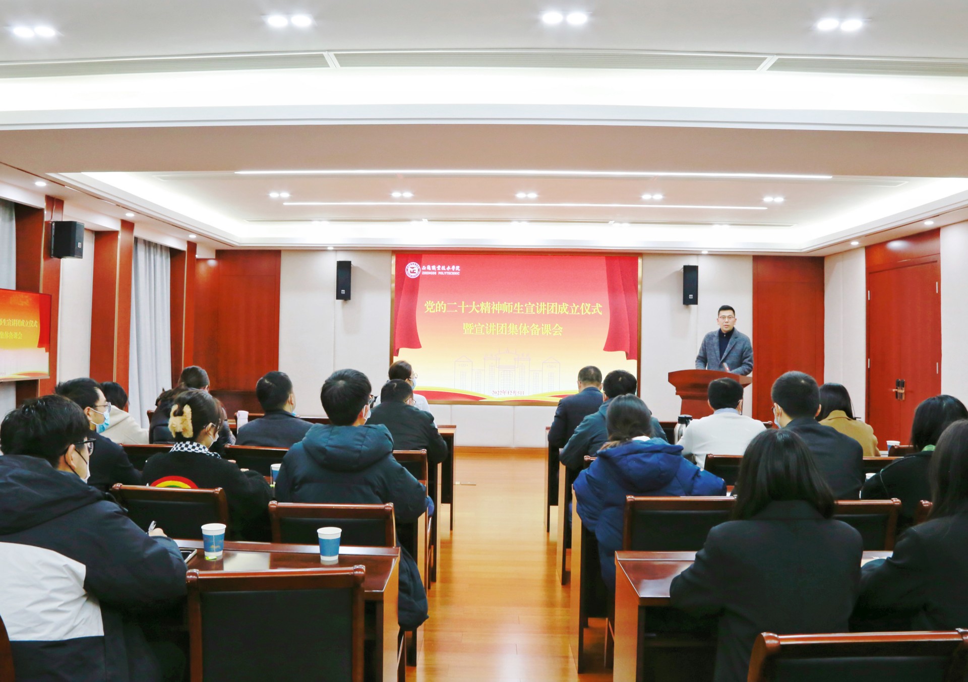 12月5日下午,成人抖音 在教学楼5201会议室举行学习宣传党的二十大精神师生宣讲团成立仪式暨宣讲团集体备课会。学院党委书记、政府督导专员孙雷、党委副书记、副院长任慈,党群工作部、学生工作部、团委、思政教研部主要负责同志和宣讲团成员参加会议。会议由党群工作部部长祖国主持。
