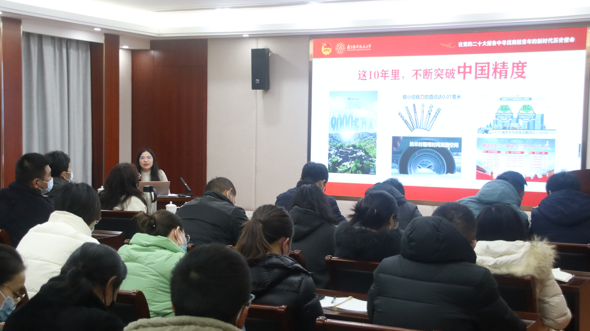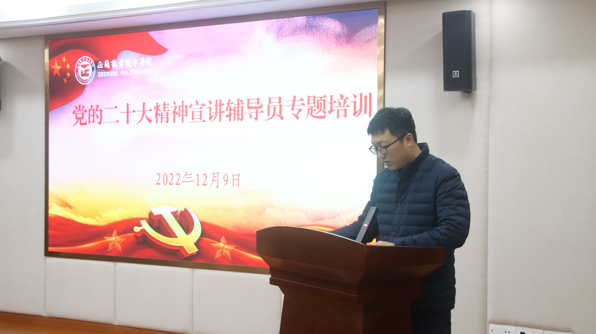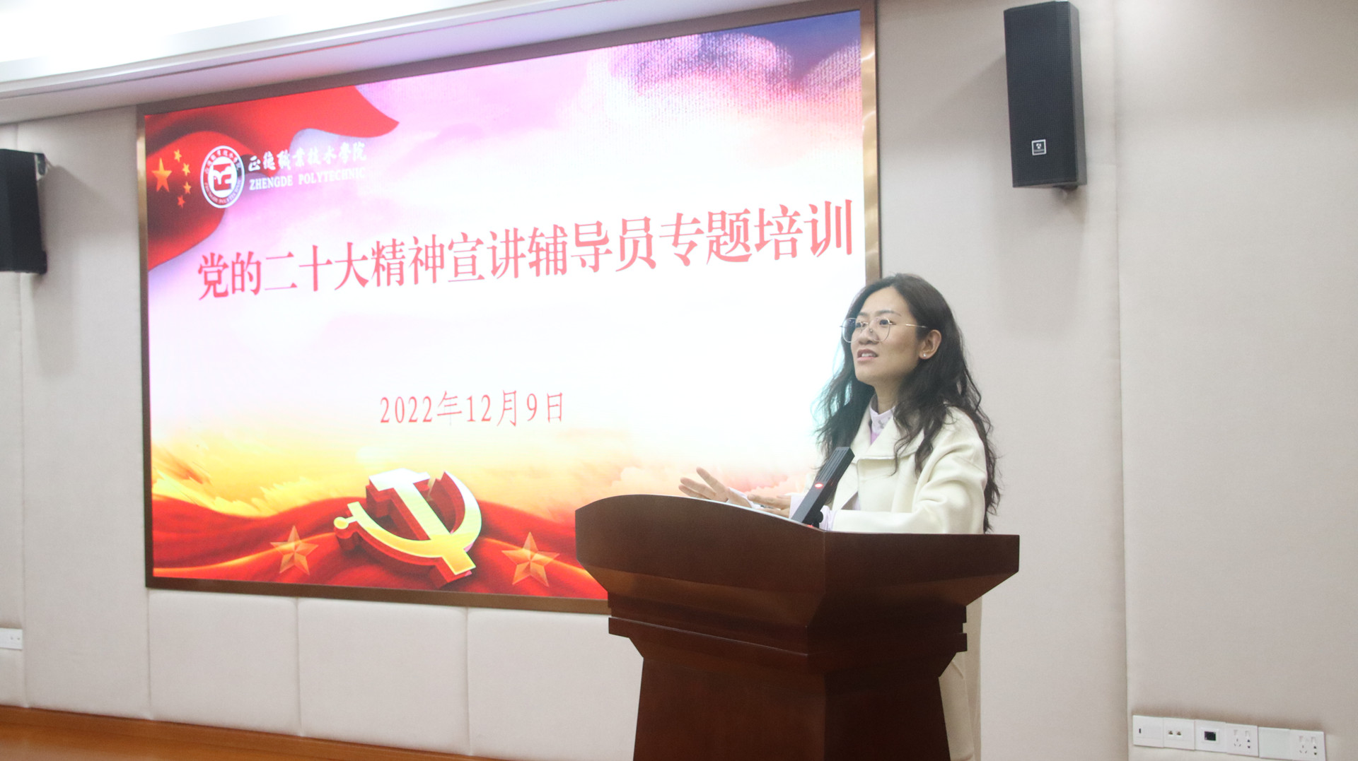 为学习宣传贯彻党的二十大精神,推动成人抖音 学生工作高质量发展,12月9日下午,学生处在5201会议室举办“党的二十大精神宣讲辅导员专题培训会”。院党委副书记、副院长任慈、院长助理王健、党委学生工作部部长、学生处处长祝佳俊及全体学工人员参加培训。会议由祝佳俊主持。