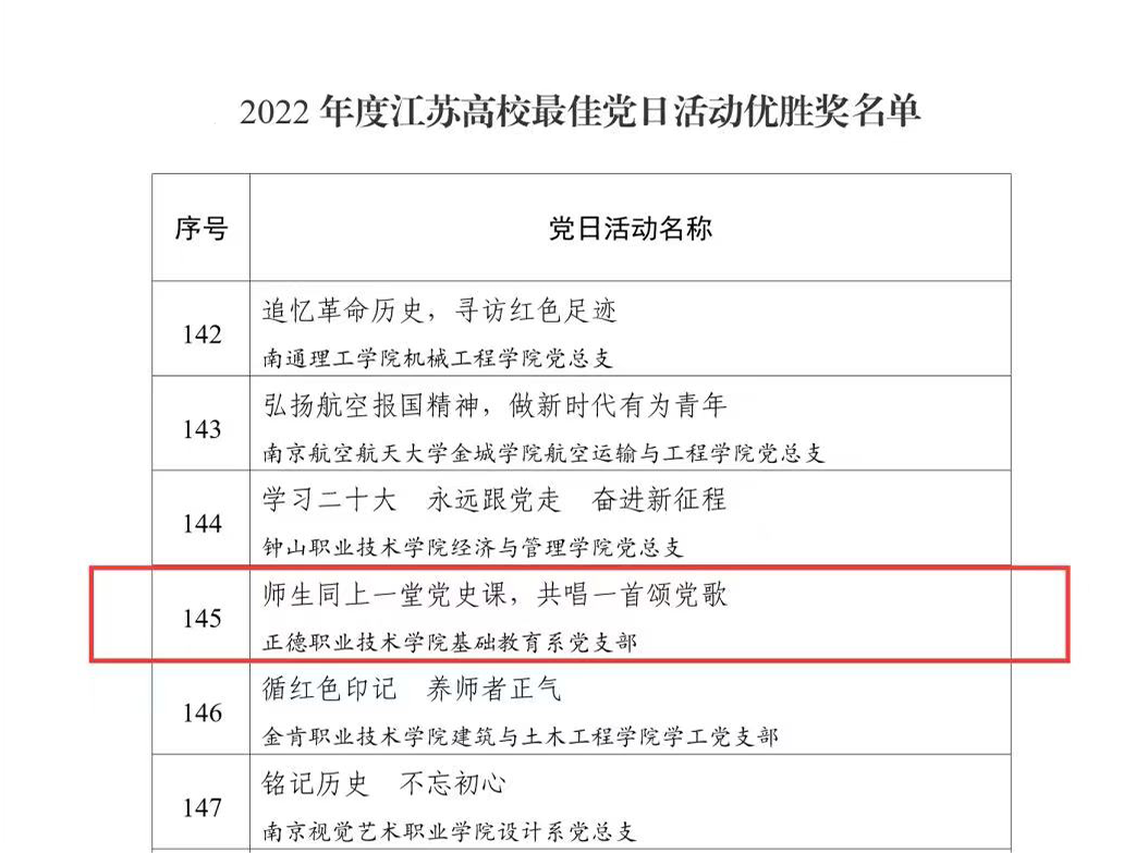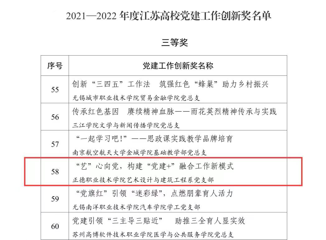 日前,江苏省委教育工委公布了江苏高校2021—2022年度党建工作创新奖和2022年度最佳党日活动优胜奖的评选结果,成人抖音 艺术设计与建筑工程系党支部的“‘艺’心向党,构建‘党建+’融合工作新模式”荣获江苏高校党建工作创新奖三等奖,基础教育系党支部的“师生同上一堂党史课,共唱一首颂党歌”荣获江苏高校最佳党日活动优胜奖。