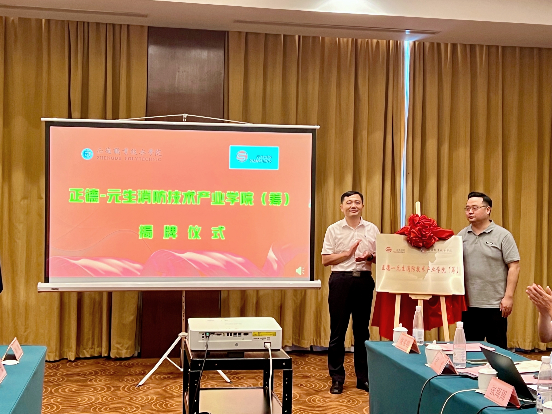 江爱华、刘臻为“正德——元生消防技术产业学院(筹)”揭牌。江爱华着重阐述了平衡企业的逐利性、教育的公益性以及学生的权益保障的重要性,在以国家利益最大化为前提下通过明确目标、科学规划、严格监管和公正评估等方式来实现校企利益平衡。