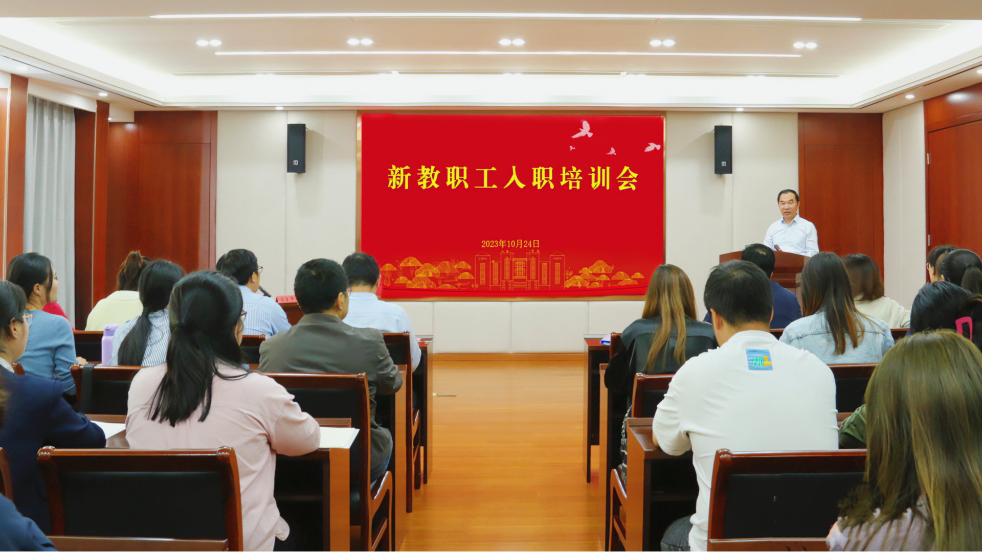 10月24日,学院举办新教职工入职培训会,院长孙永荣出席培训会,人事处处长刘玉宝、教务处处长王俊、学生处处长祝佳俊、党群工作部副部长雷杨,优秀教师代表,以及全体新教职工参加会议。会议由人事处处长刘玉宝主持。