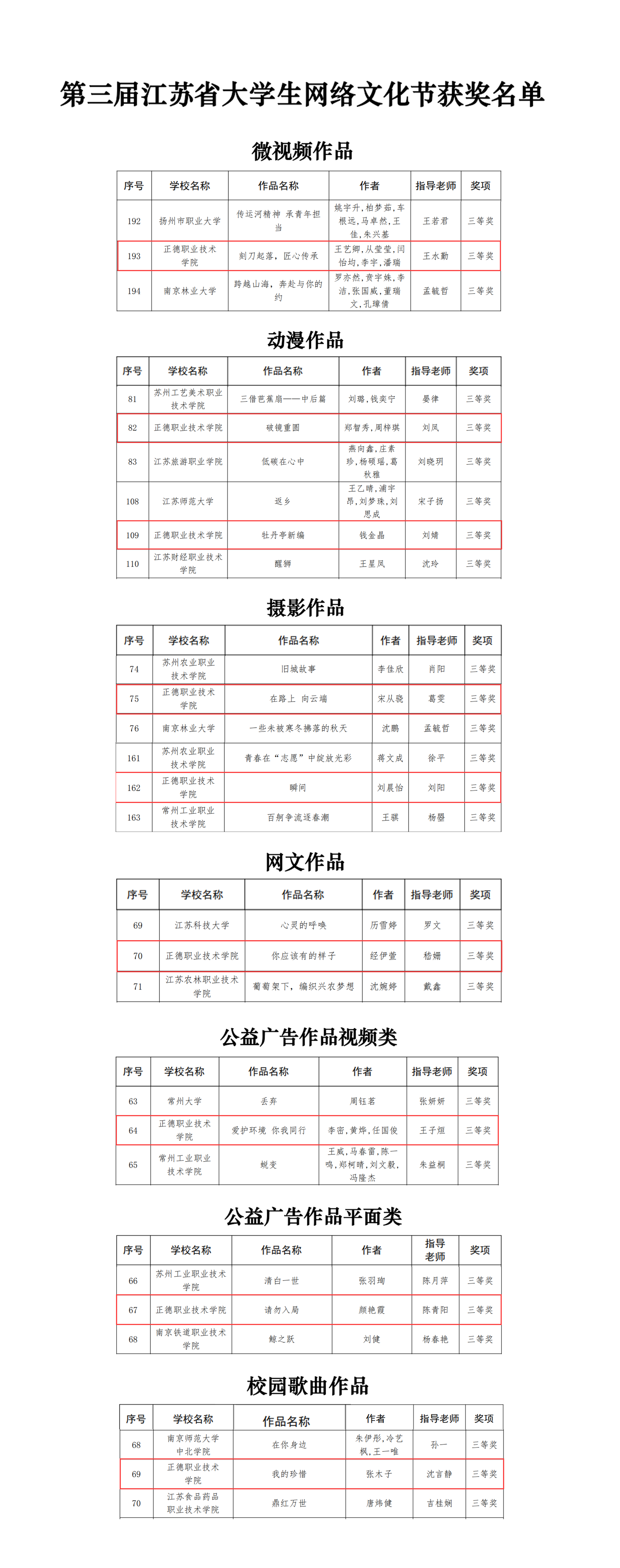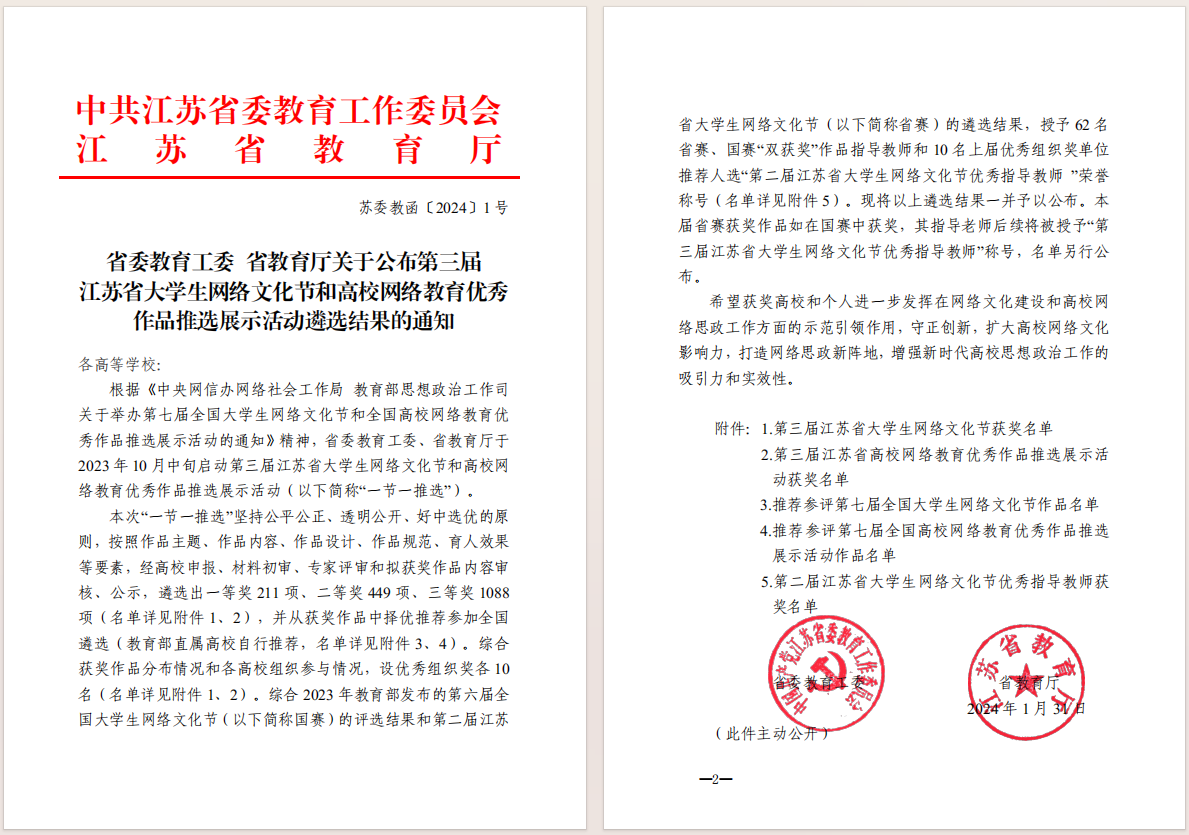 近日,由省委教育工委、省教育厅组织开展的第三届江苏省大学生网络文化节和高校网络教育优秀作品推选展示活动遴选结果发布。自2023年10月启动以来,学院高度重视、周密部署,相关部门加强沟通、广泛动员,征集到百余件优秀作品,经专业评委评审、择优推荐,成人抖音 共推选44件作品代表学院参与全省评比,共获得三等奖9个。其中3件作品被省教育厅推荐参加第七届全国大学生网络文化节评比。