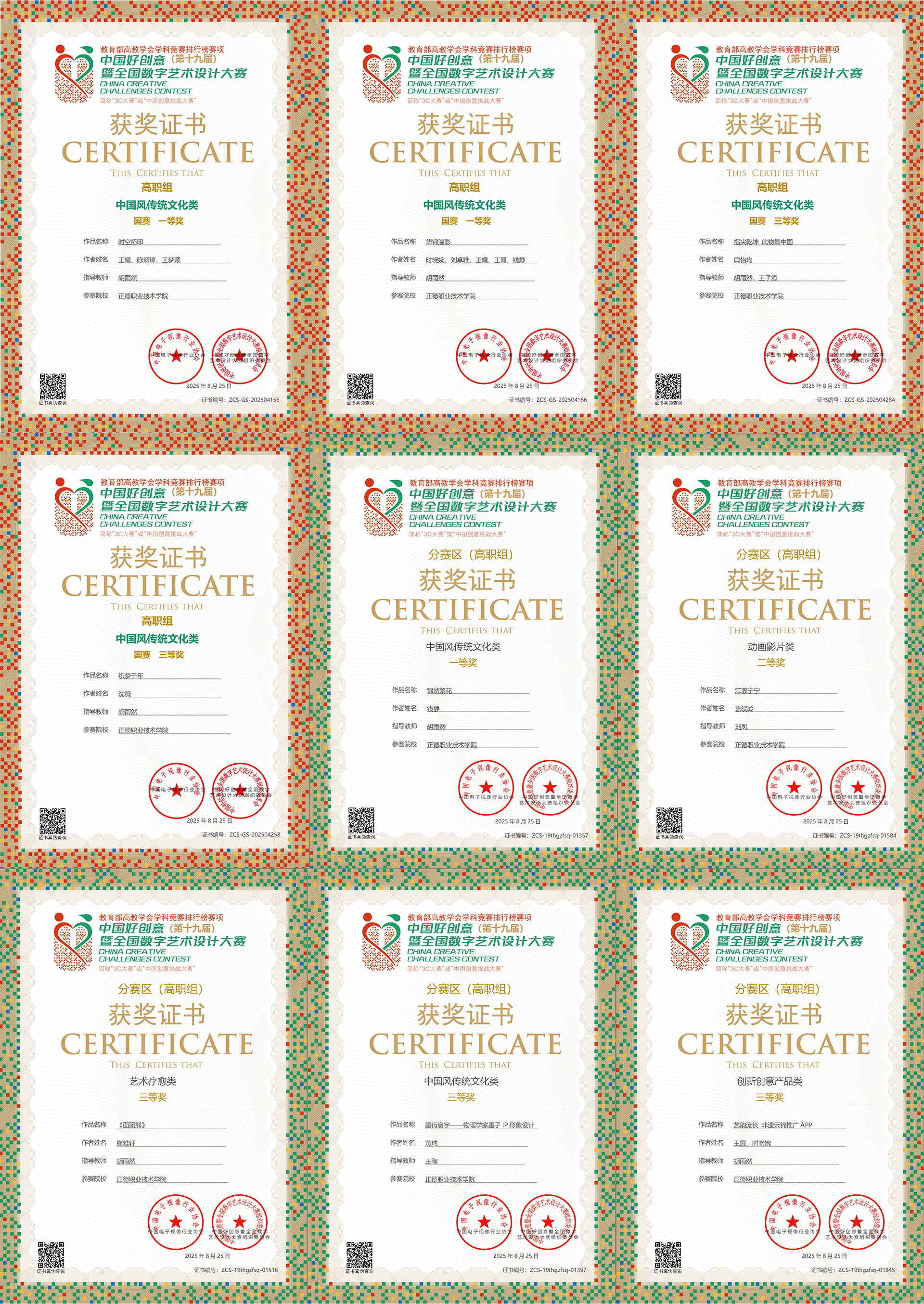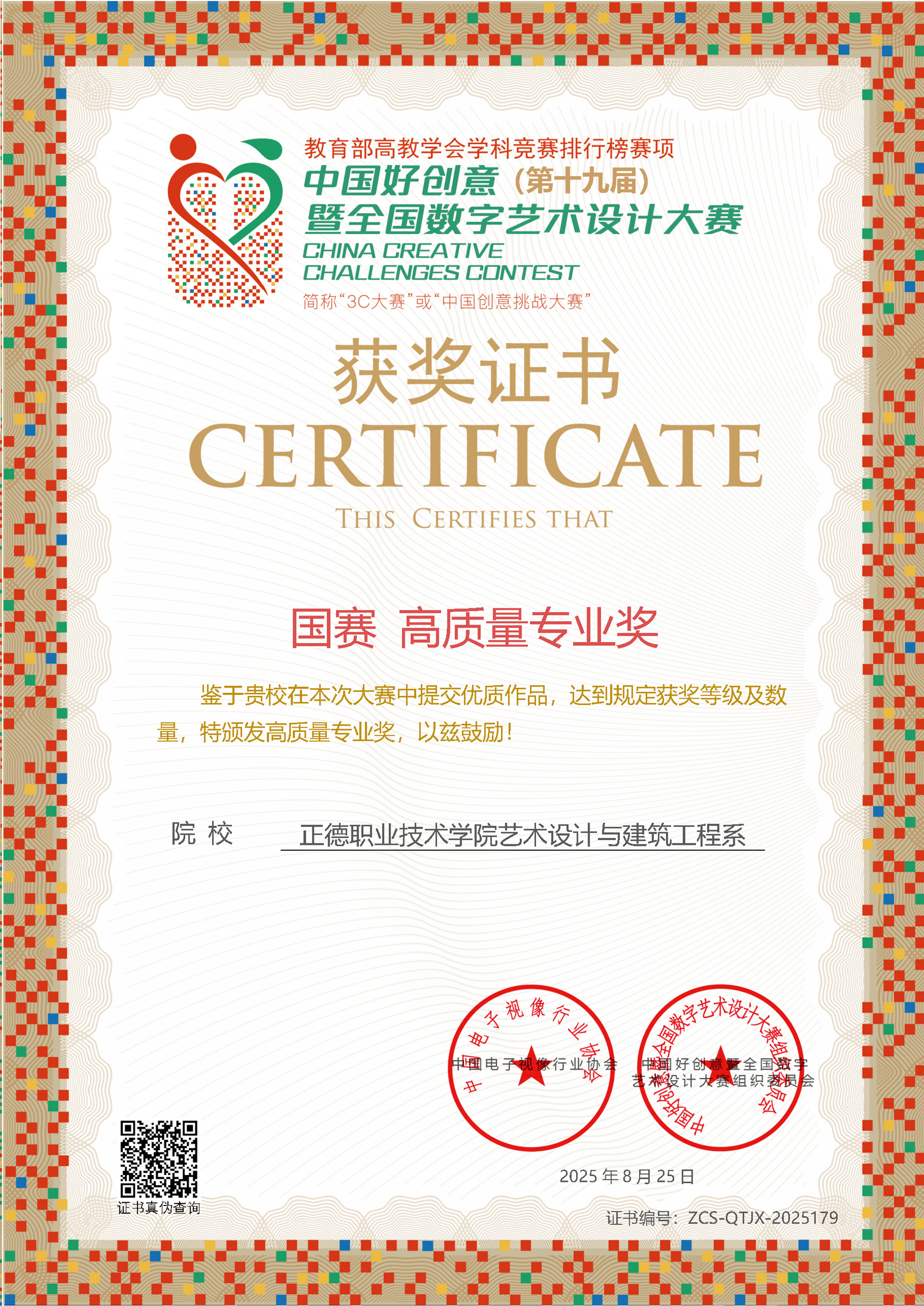 8月25日,第十九届中国好创意暨全国数字艺术设计大赛圆满落幕,成人抖音 艺术设计与建筑工程系师生凭借卓越的创意实力与专业水平,荣获国家级一等奖3项、二等奖1项、三等奖3项,省级奖项5项,并首次摘得国赛“高质量专业奖”,获奖数量与层级均创历史新高,充分彰显了系部在数字艺术教育领域的深厚积淀与创新活力。