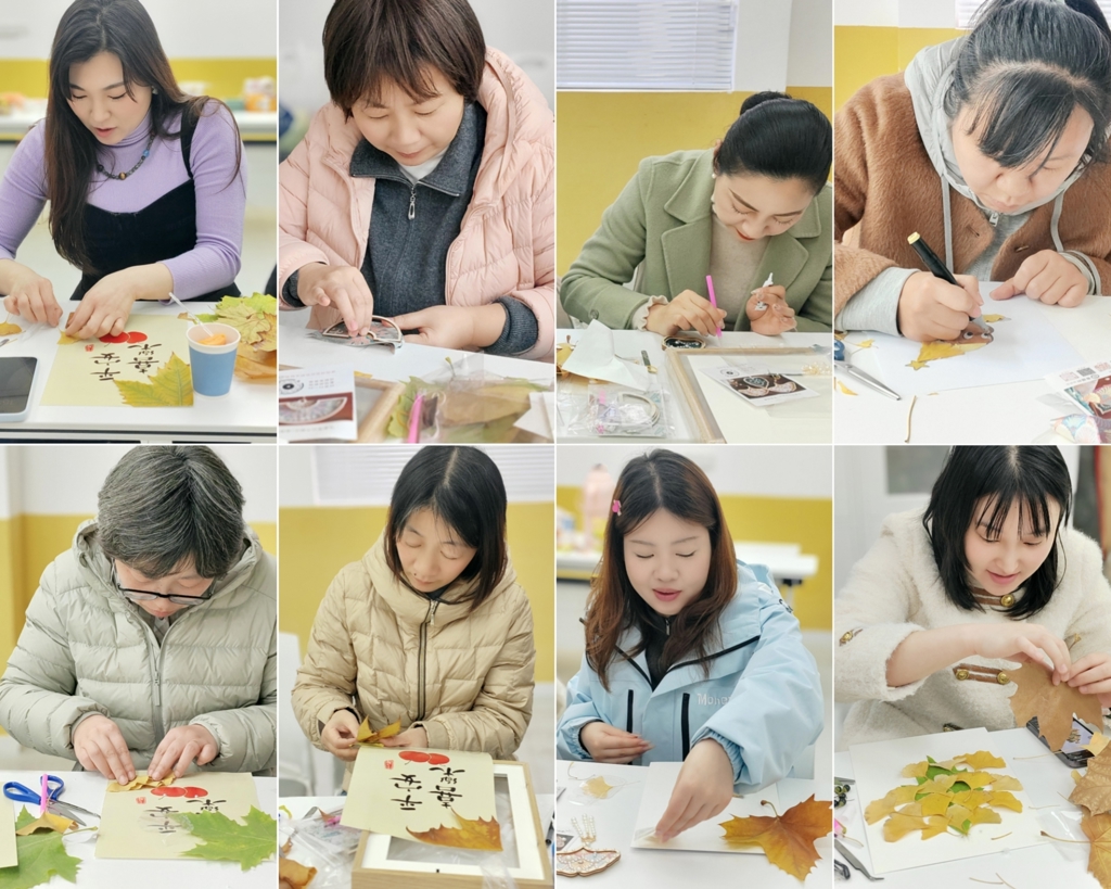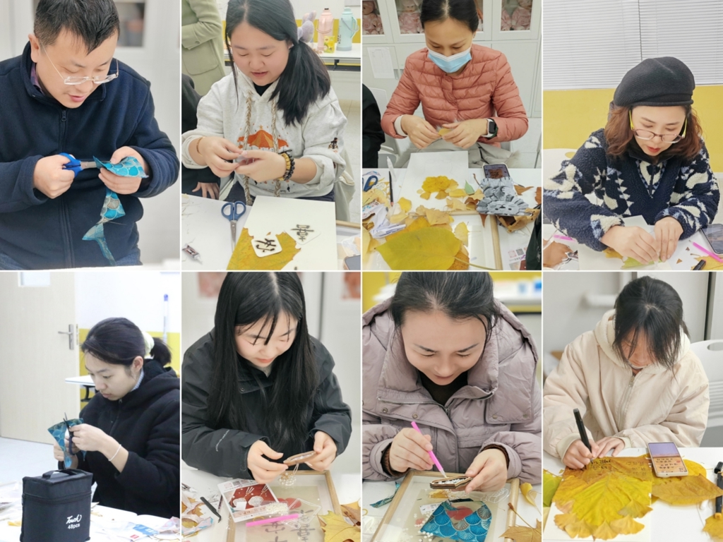 工作坊以“秋”与“叶”为主题,融合表达性艺术与自然疗愈理念,引导教职工在宁静专注的手作过程中实现情绪沉淀与心灵表达。活动中,老师们以银杏叶、菩提叶等为素材,依据叶片形态与纹理,发挥创意,制作出叶脉书签、秋意装饰画,以及融合宋锦、珍珠元素的叶形非遗手作。每一片叶子都成为自我对话的载体,大家在“以叶喻己”的象征表达中,完成了一件件独具意义的“秋日纪念”。