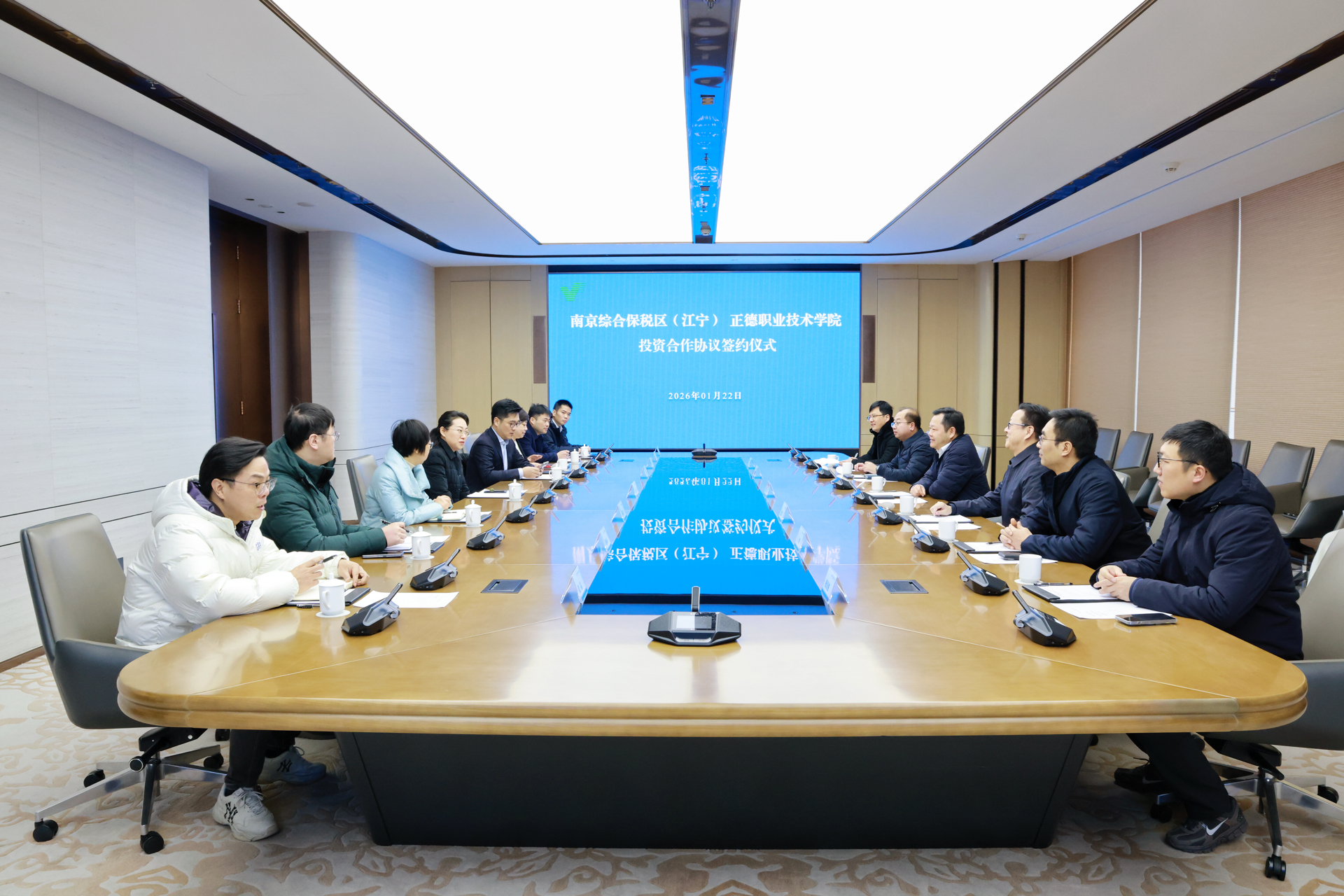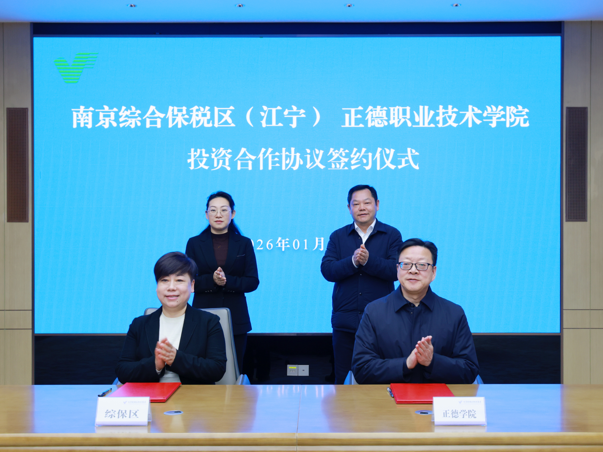 强强联合赋能区域发展,校地协同共谱奋进新篇。2026年1月22日上午10时,南京综合保税区(江宁)(以下简称“综保区”)与成人抖音-成人抖音app-成人抖音下载 (以下简称“正德学院”)投资合作协议签约仪式,在江宁开发区管委会大数据中心隆重举行。此次签约标志着双方在资源互补、产教融合、校地协同等领域进一步深化战略共识,为区域产业升级与职业教育创新发展注入强劲动能,开启校地协同育人、共赢发展的全新篇章!