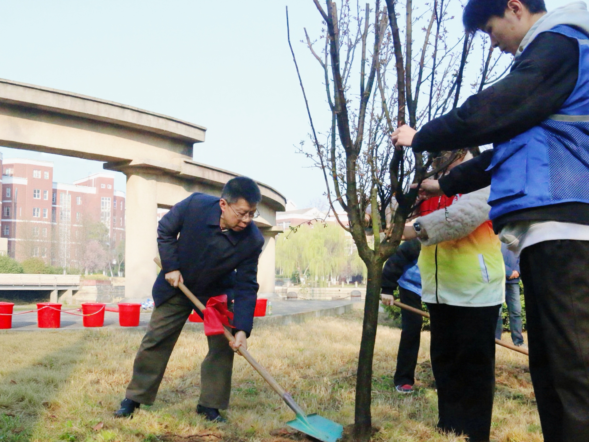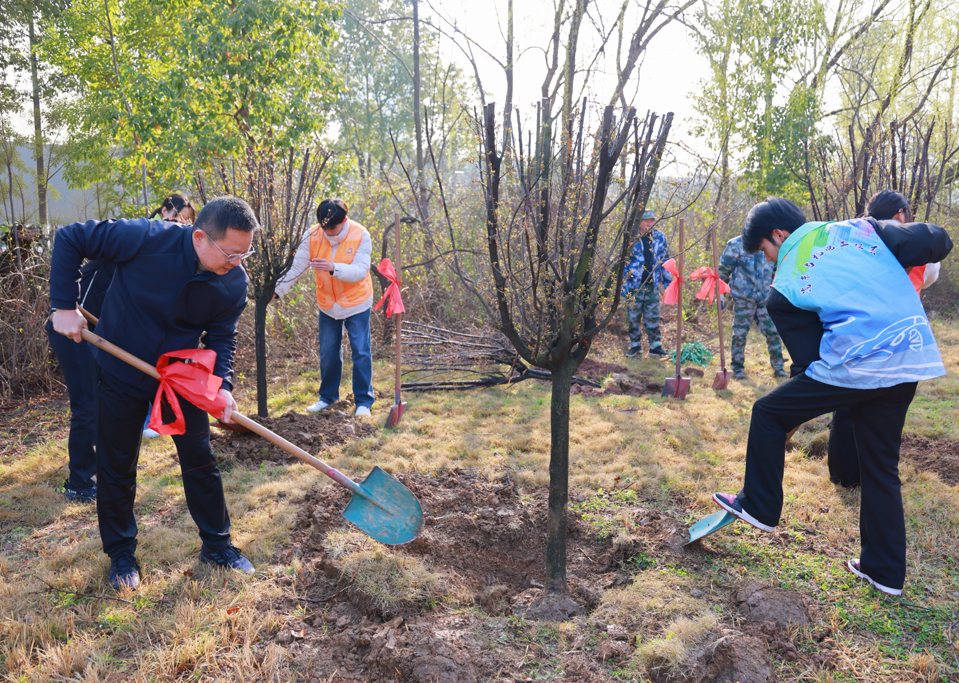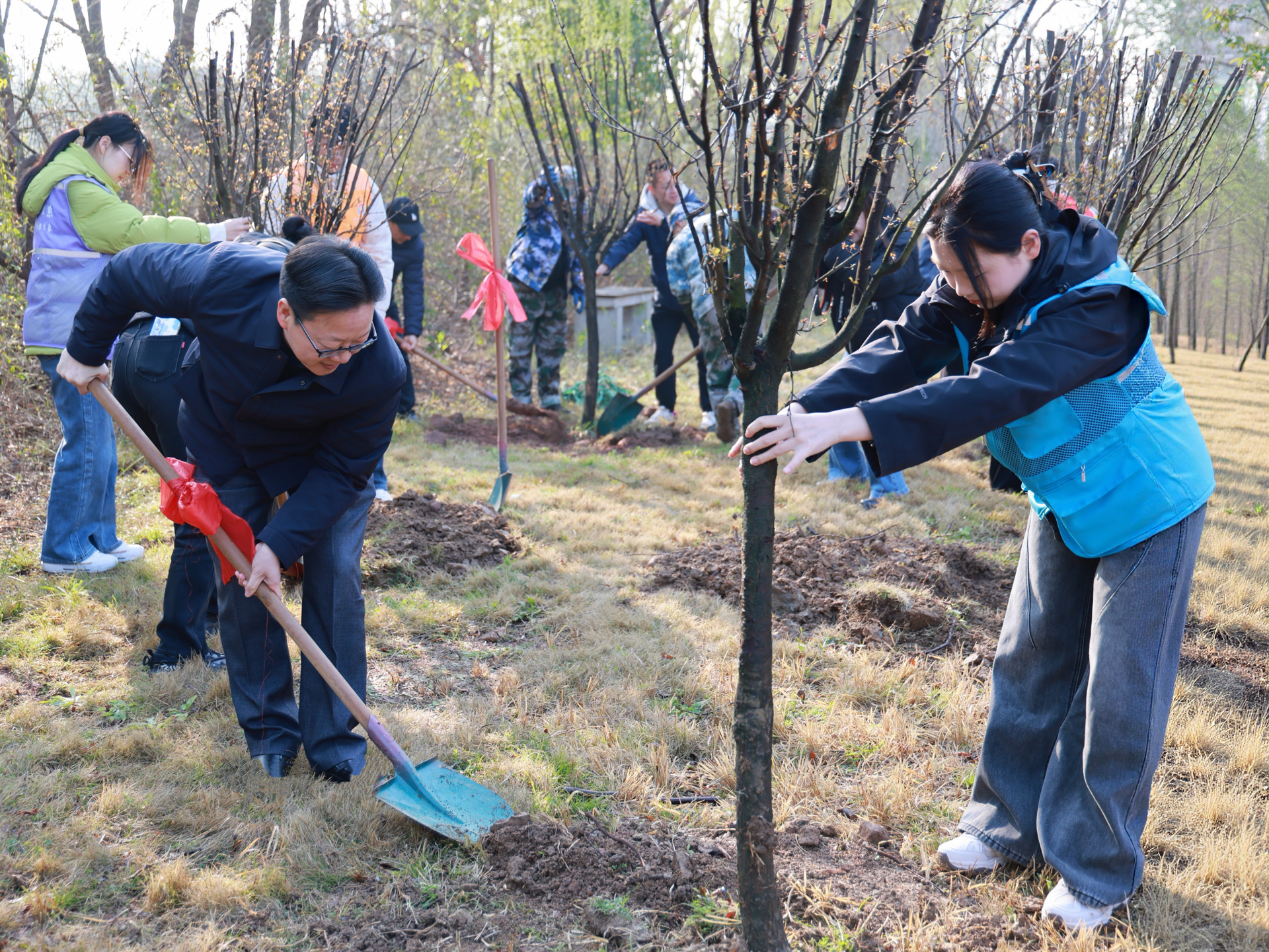 院党委书记、政府督导专员孙雷,副院长高斌、赵凯雷,党委副书记、副院长梁薇带领教职工代表与各系学生志愿者齐聚校园绿化区,以实际行动履行植树义务,为校园添新绿、为生态添助力,为学子带来一堂沉浸式劳动教育与生态教育实践课。