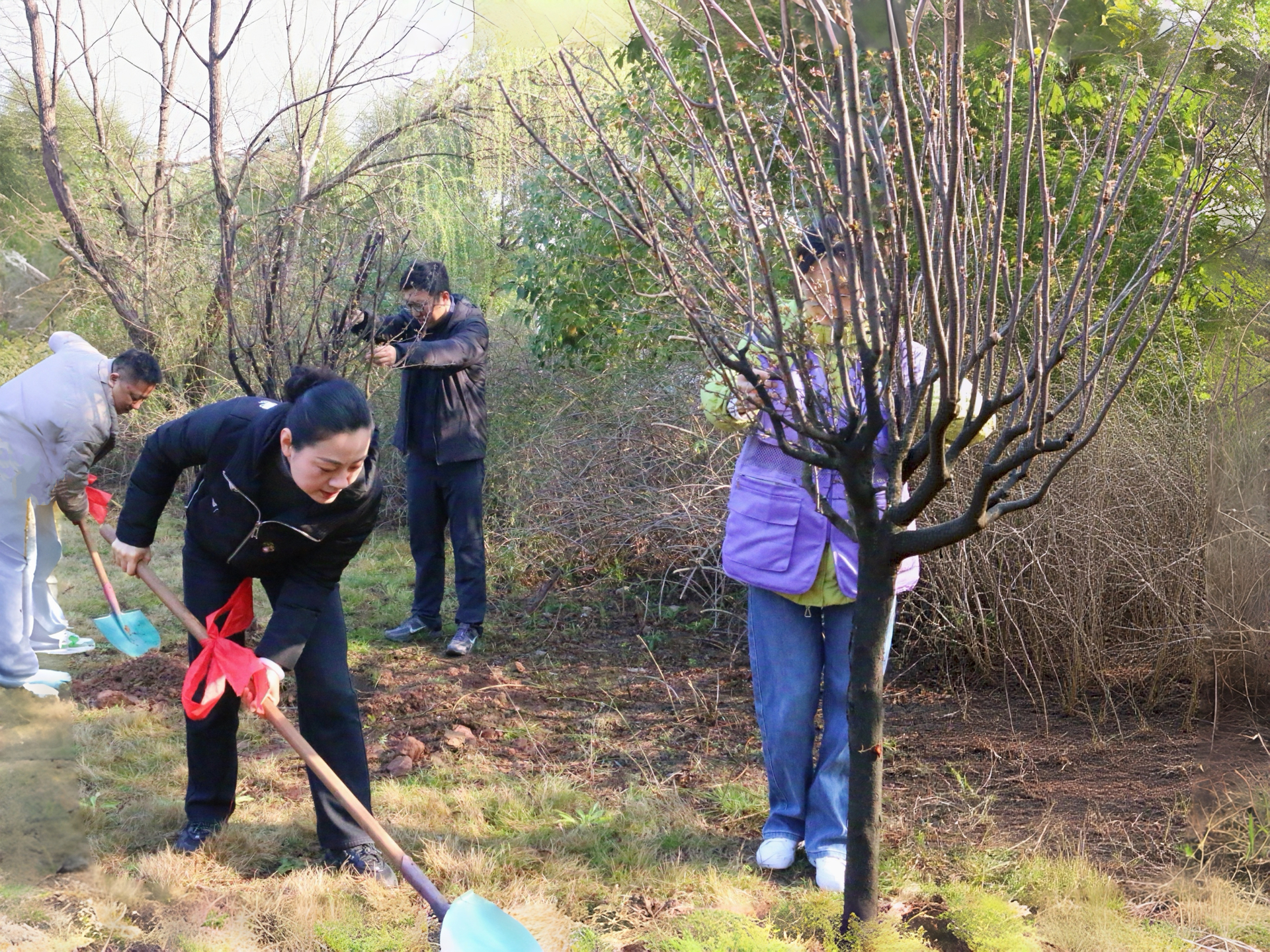 植树现场热火朝天、井然有序。师生自发分组、分工协作,挖坑、扶苗、填土、浇水,每一道工序都一丝不苟。大家躬身挥铲、细心扶苗、围堰浇水,以汗水浇灌新绿,以协作传递温暖,在劳动中体会团结意义,在实践中感悟生态价值。
