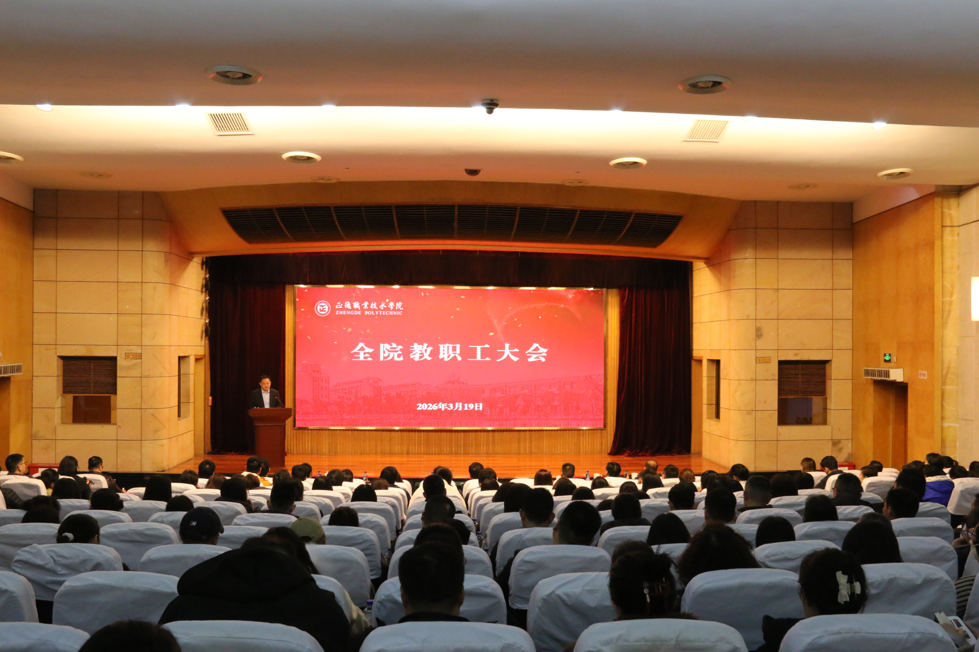 3月19日下午,成人抖音 召开2026年全院教职工大会。院长孙永荣,院党委书记、政府督导专员孙雷,副院长高斌、赵宇、赵凯雷、梁薇,院长助理王伟、王墀出席会议,全体教职工参加会议。会议由孙雷主持。