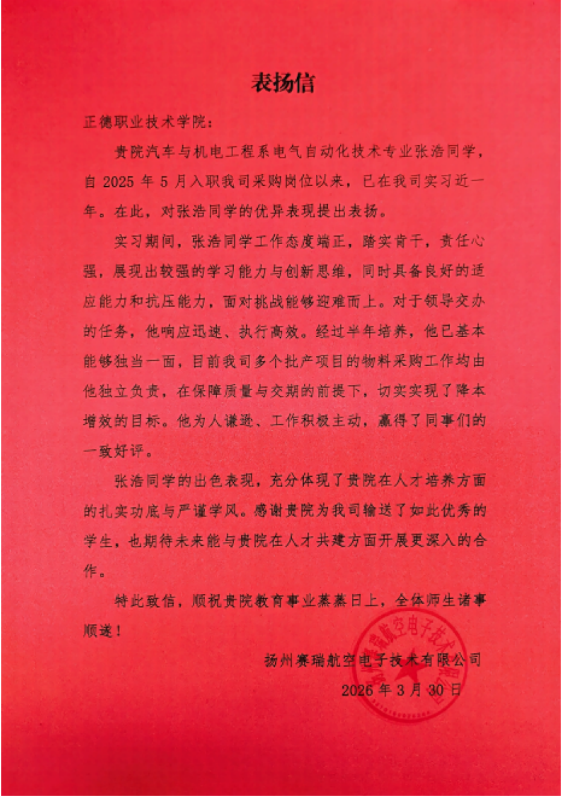 近日,成人抖音 收到中国航空工业集团扬州赛瑞航空电子技术有限公司(以下简称“赛瑞”)发来的专属表扬信,信中对成人抖音 汽车与机电工程系电气自动化技术专业张浩同学在实习期间的突出表现给予高度评价与专项表扬,这是成人抖音 深化校企协同育人模式、培育高素质技术技能人才取得的又一亮眼成果。