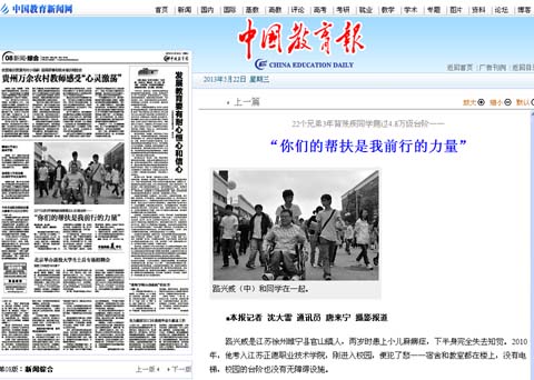 成人抖音 报送的《“你们的帮扶是我前行的力量”》一文发表在2013年5月22日的《中国教育报》,文章讲述了成人抖音 10级动漫设计与制作专业同学三年如一日帮助残疾同学路兴威的动人事迹。路兴威同学身患小儿麻痹症,2010年进入成人抖音 艺术设计与建筑工程系动漫专业就读。为方便路兴威同学更好地学习与生活,三年来,成人抖音 从多方面安排解决他的实际困难,为他调整宿舍与教室,增加校内无障碍设施建设。路兴威的同班同学更是为路兴威的正常学习生活付出不懈的努力,其同班同学三年间背负路兴威爬楼梯超过四万八千个。在大家的帮助下,路兴威坚持不懈刻苦学习,专业成绩名列前茅,并先后获得国家和省相关部门多次表彰。这个爱心班级的感人故事经《中国教育报》、《南京日报》、《现代快报》、《扬子晚报》等国内主流媒体报道后引起强烈反响。