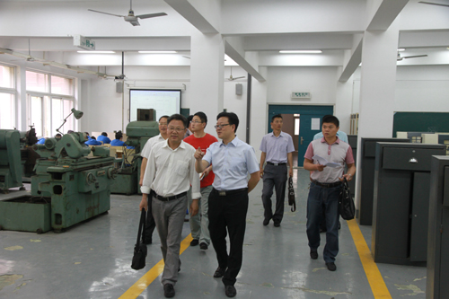 检查组组长管志强(左一)在赵凯雷副院长陪同下查看数控实训中心