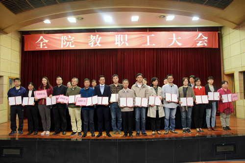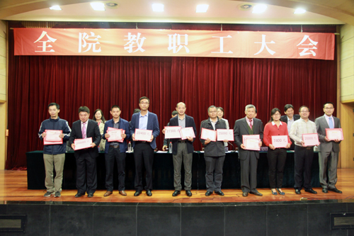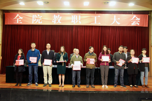 会议首先表彰了2015-2016学年获得省级表彰的先进集体和先进个人,接着,刘小廷副院长宣读了《关于表彰2015—2016学年先进单位、优秀教职工的决定》、《关于表彰2016年教学成果奖的决定》和《关于表彰2016年科研成果奖的决定》,获奖单位代表和个人先后上台领奖;赵凯雷副院长宣读了《关于表彰2016年招生工作先进小组和先进个人的决定》,获奖先进小组代表和先进个人分别上台领奖。