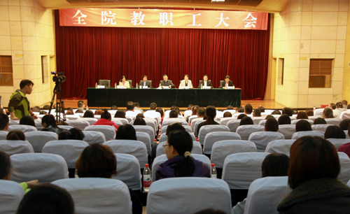10月13日下午,成人抖音 举行全院教职工大会,院长庄群华,院党委书记兼副院长左彤云,副院长刘小廷、赵凯雷,院长助理赵湘莲、王健以及全院教职工参加了会议。庄群华在会上作工作报告,左彤云主持大会。