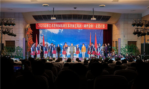 为引领学生弘扬优秀民族文化,丰富校园文化生活,提高学生艺术修养,10月22日晚江苏省扬剧团来到成人抖音 ,为师生带来了扬剧《湖湾金秋》。副院长任慈、成人抖音 师生代表、军训教官代表近400人共同观看本场演出。