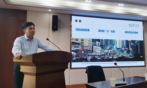 蔡智勇结合实际案例生动地阐释了危机的风险因素、危机的易感人群、危机常见的情况、易观察到的危机信号以及辅导员的应对策略五个方面的内容。蔡教授表示,作为与学生接触最多的群体,辅导员老师应该树立好科学的观念,知道危机的可预防性,掌握危机预防的有效方法,将立德树人与校园安全相统一、教师成长与学生获益共同步。