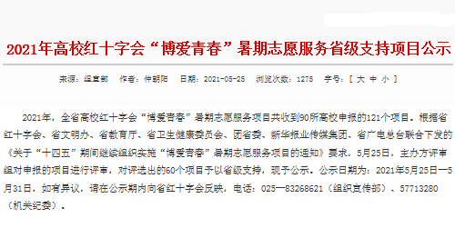 根据省红十字会、省文明办、省教育厅、省卫生健康委员会、团省委、新华报业传媒集团、省广电总台联合下发的《关于“十四五”期间继续组织实施“博爱青春”暑期志愿服务项目的通知》要求, 2021年,省红会面向全省高校开展“博爱青春”暑期志愿服务项目申报评选,最终经主办方评审组审核,对成人抖音 《留下温暖守护成长》等60个项目予以省级支持,提供资助经费用于项目活动开支。