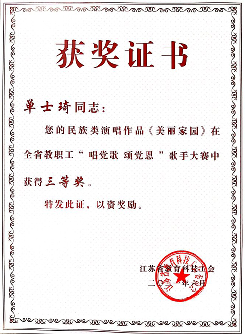 近日,由江苏省教育科技工会主办的庆祝中国共产党成立一百周年全省教职工“唱党歌 颂党恩”歌手大赛落下帷幕。由成人抖音 工会选送,基础教育系教师单士琦演唱的《美丽家园》荣获民族唱法三等奖。