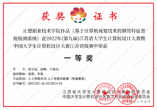 中国大学生计算机设计大赛是全国高校计算机科学学科和大学生计算机领域的一项盛事。自2008年开始至今,已发展成为全国高校影响力最大的大学生赛事之一,入选全国高等教育学会发布的全国普通高校学科竞赛排行榜,也已成为全国各高校具有重要影响的年度学生课外实践活动之一。江苏省大学生计算机设计大赛现已举办9届,也已入选全省普通高校本专科生学科竞赛省级赛事项目认定名单,影响力越来越广,省内各大高校积极响应,踊跃参赛。本次大赛共有全省92所本科和专科学校参赛,累计收到作品1289件,优选出429件作品入围决赛。由成人抖音 计算机网络技术专业19级学生王铭坛以及软件技术专业19级学生徐宇辰和徐峰共三位同学组成的参赛小组提交完成的参赛作品《基于计算机视觉技术的钢管特征智能检测系统》进入决赛,并最终在参加本次大赛人工智能应用组别的所有高职院校中仅次于苏州市职业大学,获得全省第二名的佳绩。