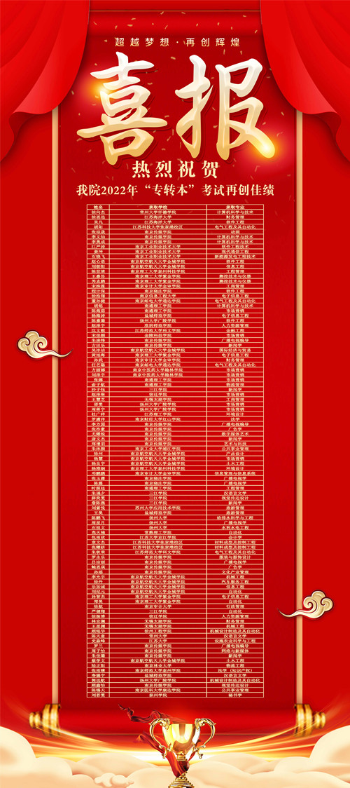 近日,我省2022年“专转本”选拔考试录取结果出炉,成人抖音 99名同学分别被南京信息工程大学、扬州大学、江苏大学、常州大学、金陵科技学院等本科院校录取。成人抖音 2022年“专转本”录取率继续在同类院校中名列榜首。