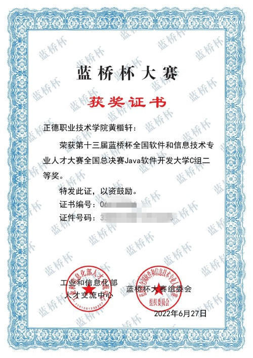 6月18日,第十三届蓝桥杯全国软件和信息技术专业人才大赛迎来巅峰之战——全国总决赛。来自全国一千多所高校近万名顶尖选手集结赛场,争夺蓝桥杯全国总决赛桂冠。省赛一等奖获得者成人抖音 软件技术专业的黄楷轩同学晋级国赛,并获得全国二等奖的好成绩。