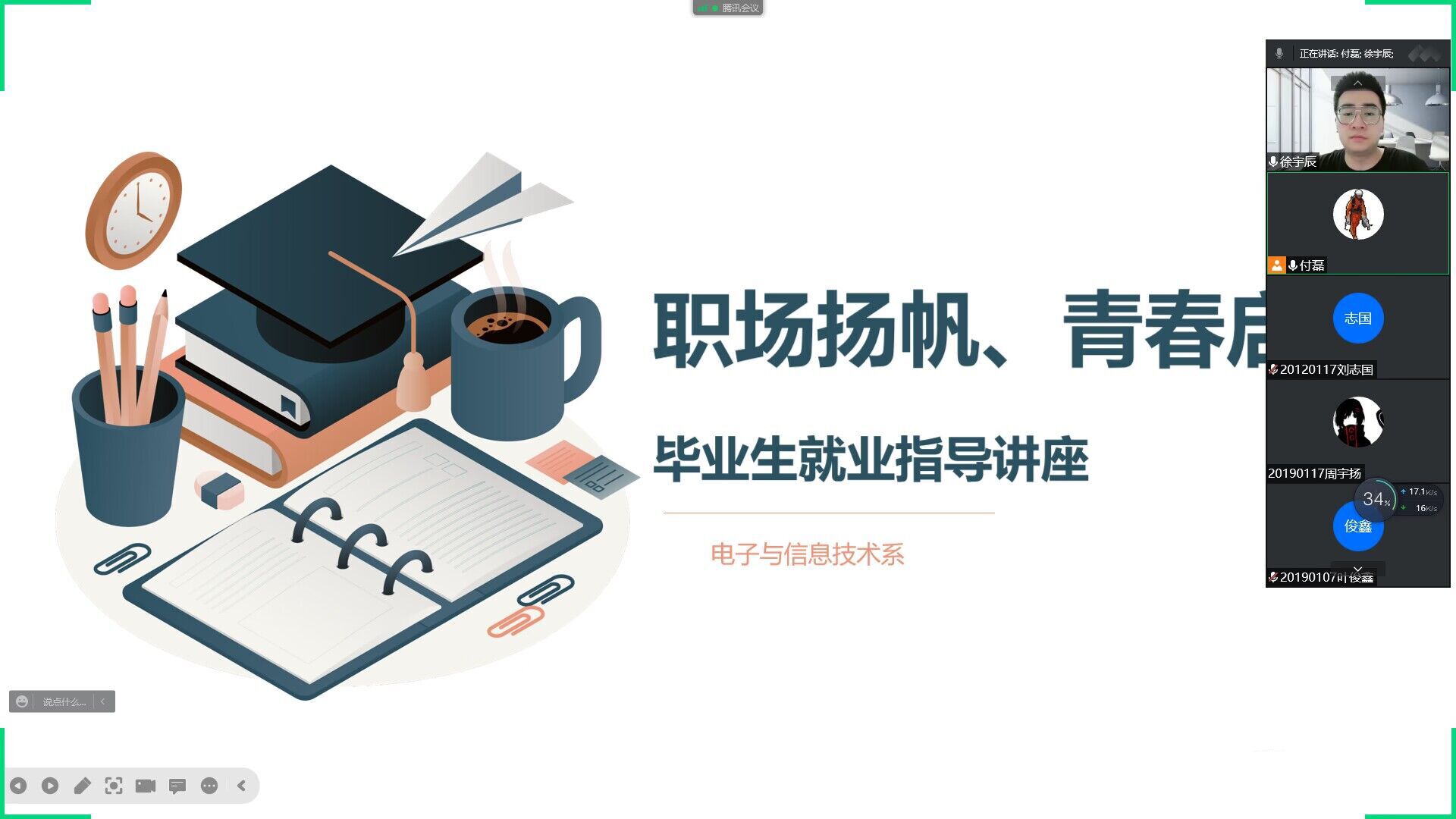 讲座结束后,徐宇辰通过ppt宣讲的形式向与会同学展示了自己所在公司南京上宇禾科技的成人抖音、岗位需求、发展前景、薪资待遇等信息。同学们针对自己感兴趣的问题与徐宇辰进行线上交流沟通,主动了解用人单位的基本情况并表达自己的求职意向,徐宇辰对毕业生的就业疑惑进行了详细的解答,有求职意向的同学在线上进行了简历投递。