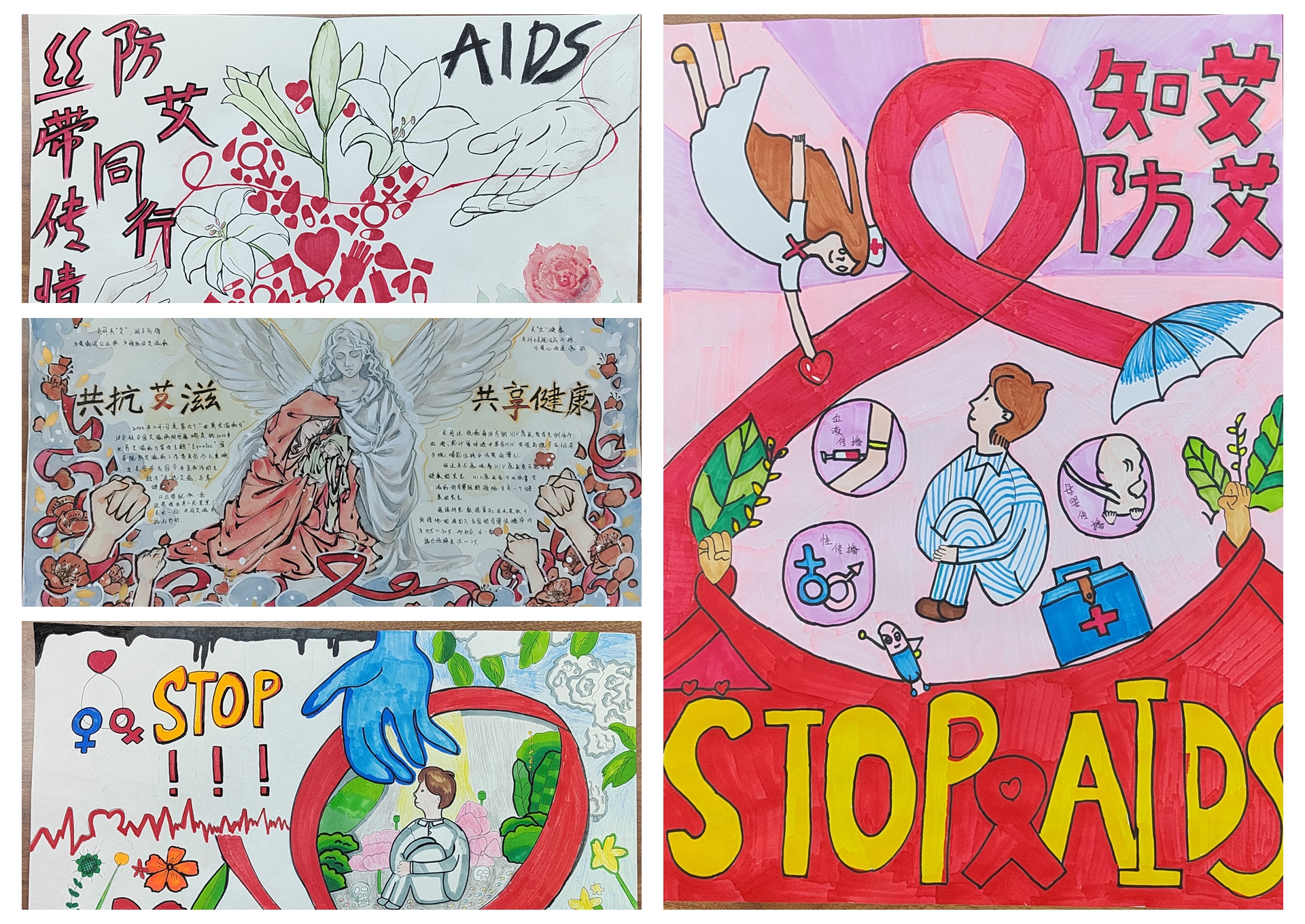 最后,同学们通过手抄报的形式展现了如何预防艾滋病、如何包容关爱艾滋病患者以及增强艾滋病防控知识等。他们借彩笔勾勒有关艾滋病的预防知识,用言语宣传预防艾滋病教育,用警示之心描绘,关注生命,拒绝艾滋。