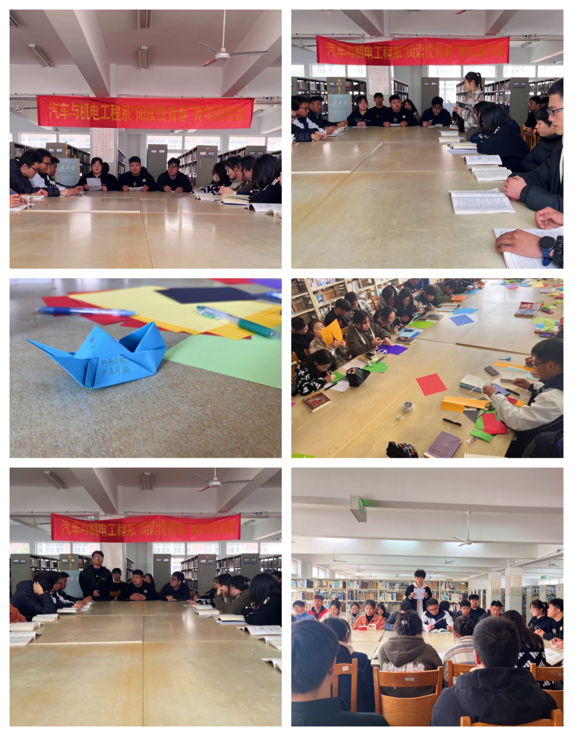 为学习贯彻党的二十大精神,激发同学们的爱国爱党热情,让同学们在阅读中寻找灵感,在交流中碰撞出思想的火花,鼓励汽车与机电工程系学子在阅读中增强文化自信,深耕文化底蕴,提升文化素养。2023年3月2日下午,汽车与机电工程系于成人抖音 图书馆开展“阅读悦青春,逐梦新征程”读书分享会,汽机系学生会成员及部分22级同学参加活动。