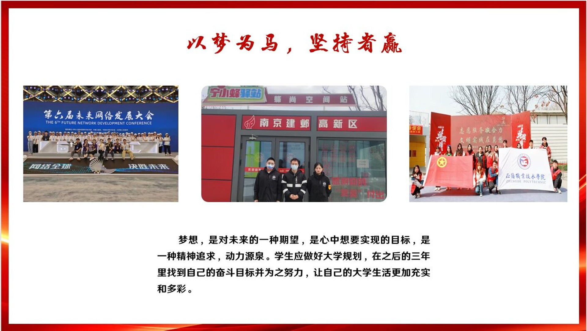戴立志,2021年9月就读于电子与信息技术系计算机网络技术专业,现担任院青年志愿者协会主席、系辅导员助理,211301班班长,曾荣获院三好学生、院一等奖学金、院优秀学生干部,江苏省优秀志愿者等荣誉称号。他为2021级学生做了“以梦为马,坚持者赢”的主旨演讲,戴立志详细讲述了自己作为青年志愿者和班级班长的经历和感悟,重点向大家传授工作与学习的冲突时的处理方法。并大家分享了信心、决心与恒心这三样法宝。提醒大家要充分利用好大一的时间,做好规划,行动起来,朝着目标勇敢前进。