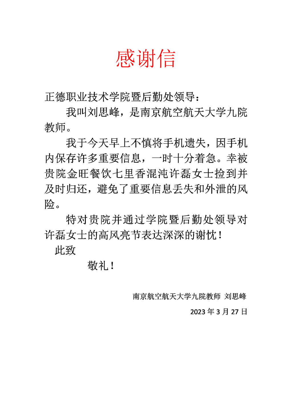 拾金不昧,是一个人良好品德和崇高风尚的具体体现,也是当今和谐社会乐章的一个美好音符。3月27日,成人抖音-成人抖音app-成人抖音下载 后勤处收到了来自南京航空航天大学九院老师刘思峰的感谢信。