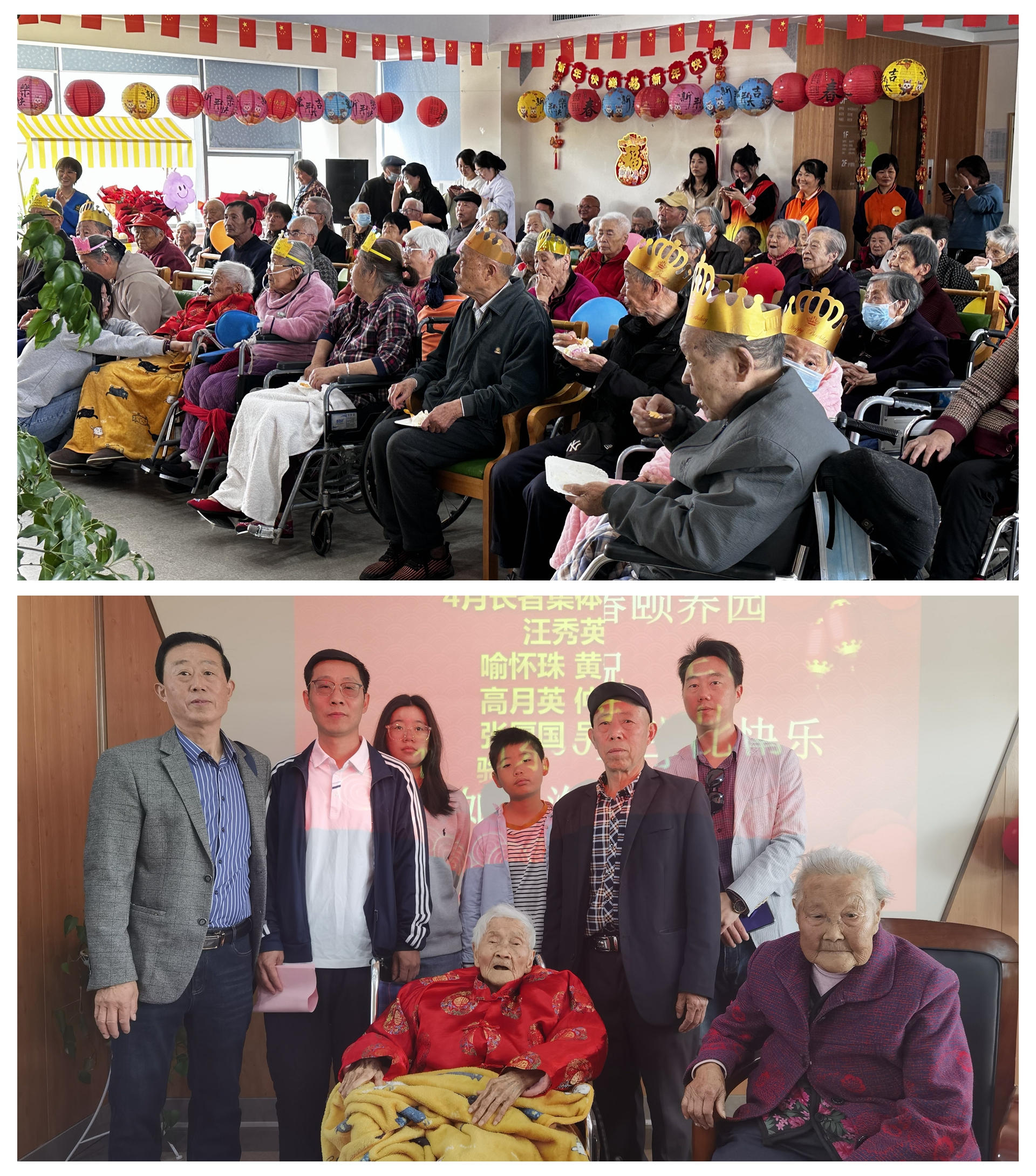 4月25日上午,银城松椿颐养园为四月份生日的8个老人过集体生日,其中有一位百岁老人——汪秀英奶奶。基础教育系“微光”巾帼志愿者队的20名志愿者前来和这里的50多位老人们以及20多位家属们共同度过了一场难忘的集体生日会。