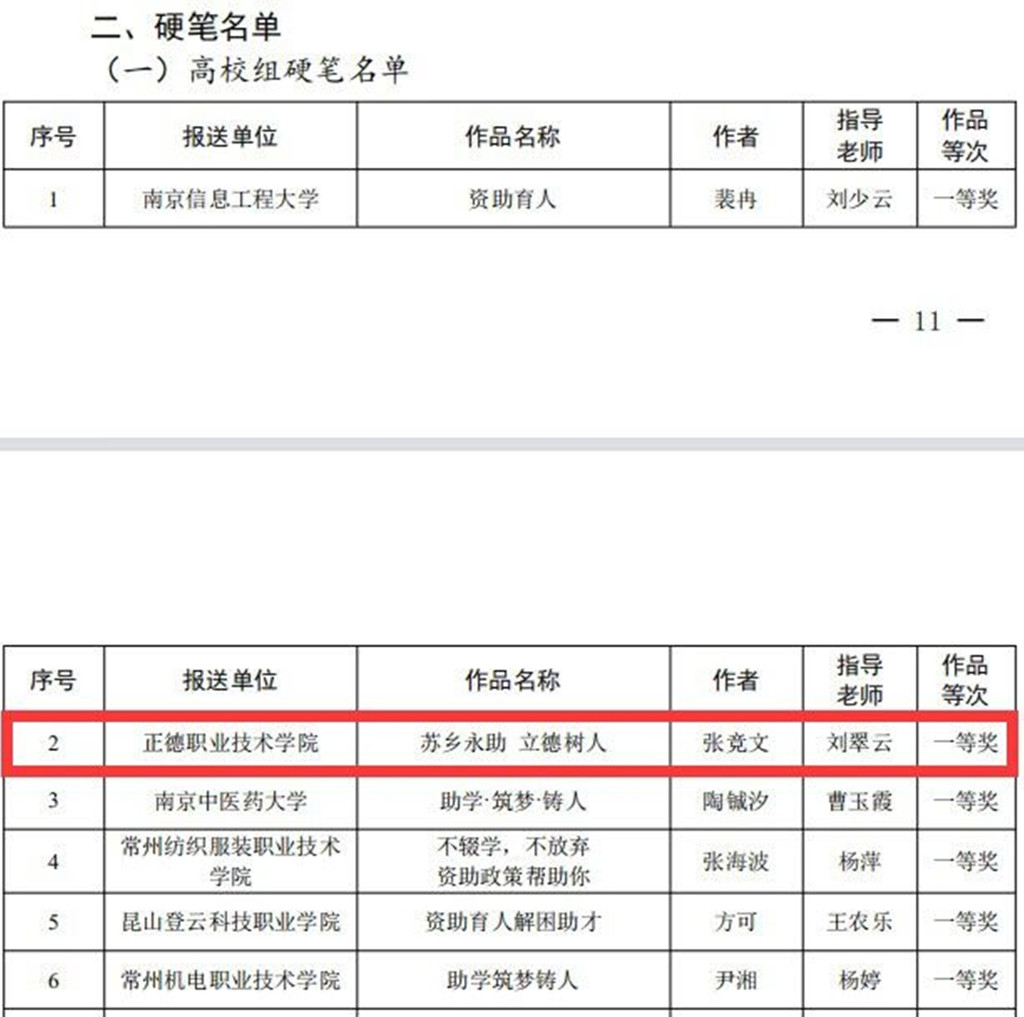 成人抖音 基础教育系张竞文同学作品《苏乡永助 立德树人》获得硬笔书法一等奖、杨洁同学作品《强国有我》获得硬笔书法三等奖、裘璧嘉同学作品《苏乡助学诗一首》获得软笔书法三等奖。