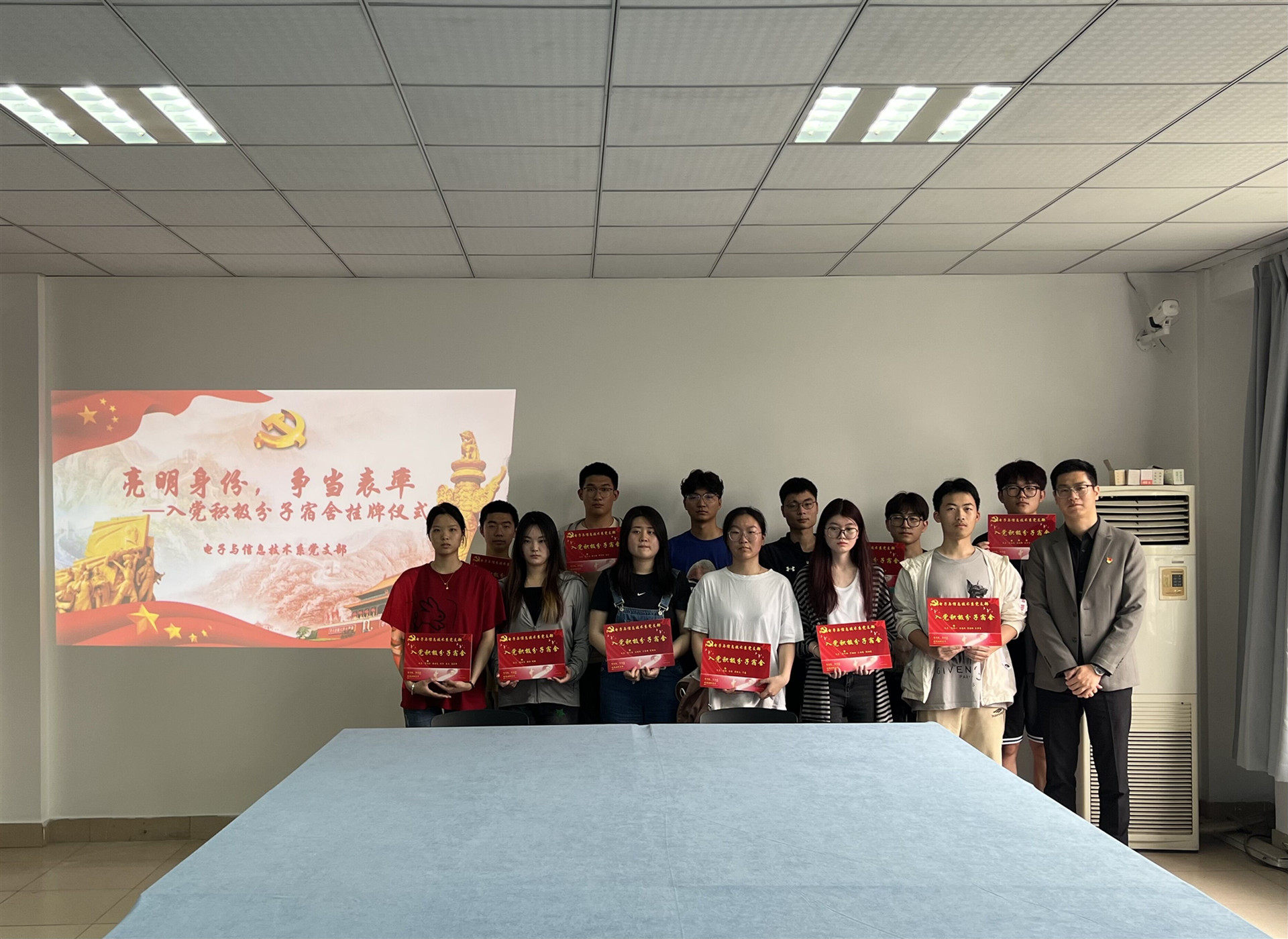 电子与信息技术系党支部书记、副主任赵欣在活动中为入党积极分子宿舍逐一授予“入党积极分子宿舍”标识牌,他强调,入党积极分子作为全系优秀学生代表,要牢记身份,在学习上奋力拼搏,在生活中尊德守纪,养成谦虚务实的工作作风,同时对于个别困难宿舍要及时进行“1+1”宿舍帮扶,将新思想正能量带到课堂带进宿舍,以点带面,辐射全体,努力提高学生在宿舍生活中的自我管理、自我监督、自我教育意识,强化公寓育人功能,为营造良好的宿舍氛围,创造积极向上的学习氛围和建设“文明宿舍”贡献自己的力量。