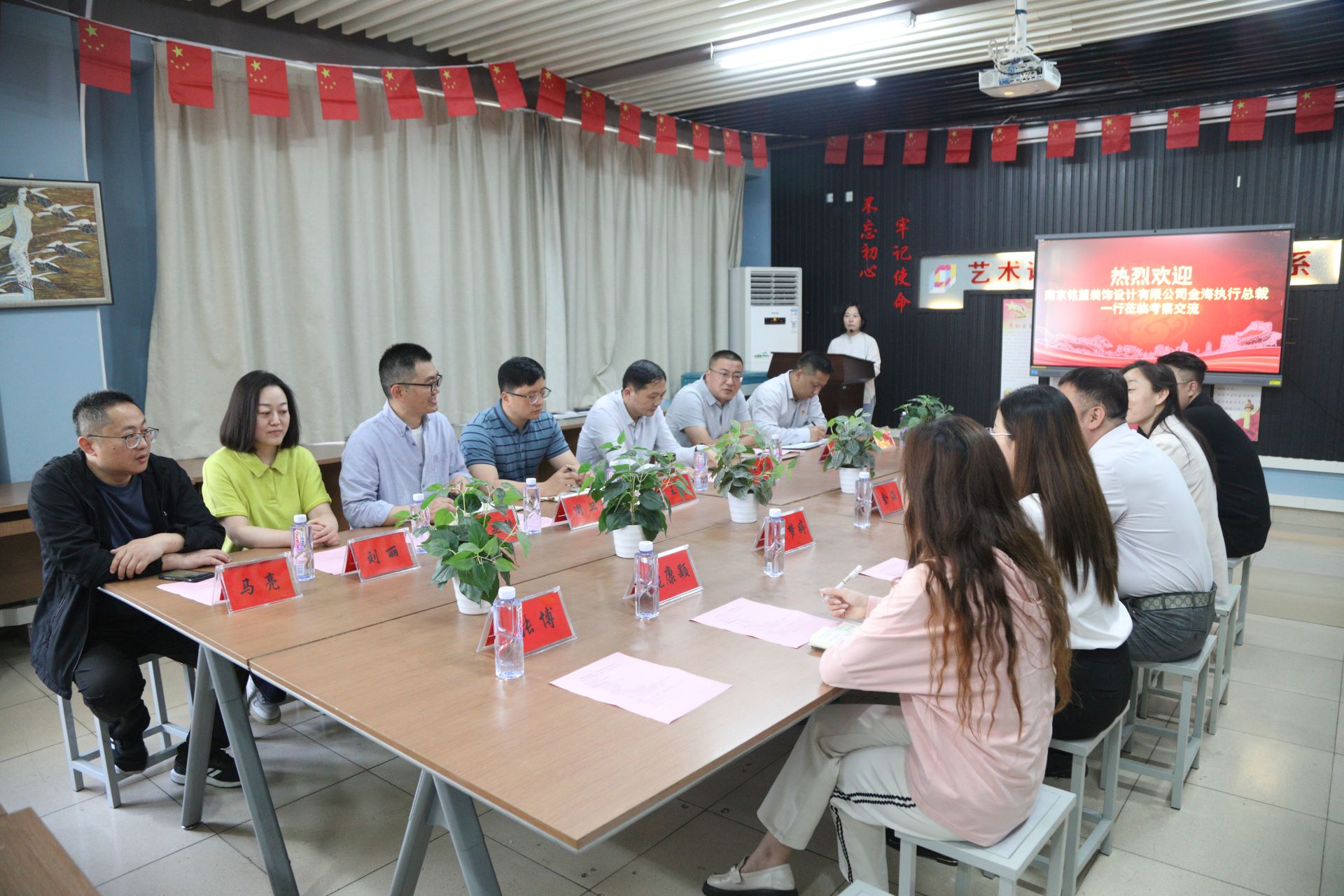 南京铭望装饰设计有限公司(以下简称铭望装饰)执行总裁金海、副总经理兼公司党支部书记王雪璐、人事行政经理吕梦婷、设计部经理冯海及随行宣传企划工作人员;成人抖音 江爱华副院长、教务处长王俊、教务处副处长兼校企办主任陆松、艺术设计与建筑工程系副主任周卫(主持工作)、副主任兼党支部书记陈宏波、建筑与装饰教研组长冯显静及相关专业负责人共同出席了本次颁奖仪式和交流会。会议由周卫主持。