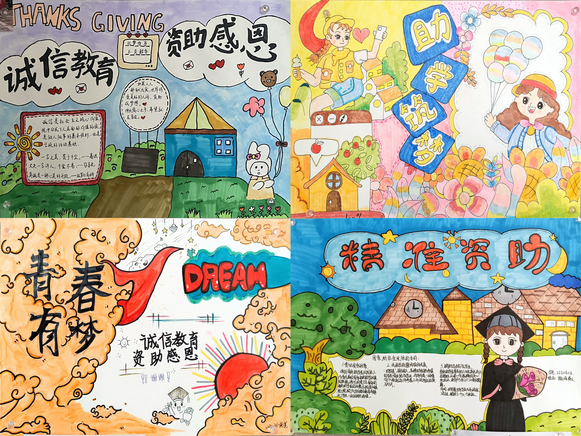 基础教育系于5月15日-6月10日举办了诚信教育,感恩资助为主题的画展活动。本次活动面向全系学生,共收到50余幅作品,每幅作品与活动主题紧密相连,充分展示了同学们对诚信和感恩的认知、尊重与珍视,本次活动还评选出一等奖9副作品。