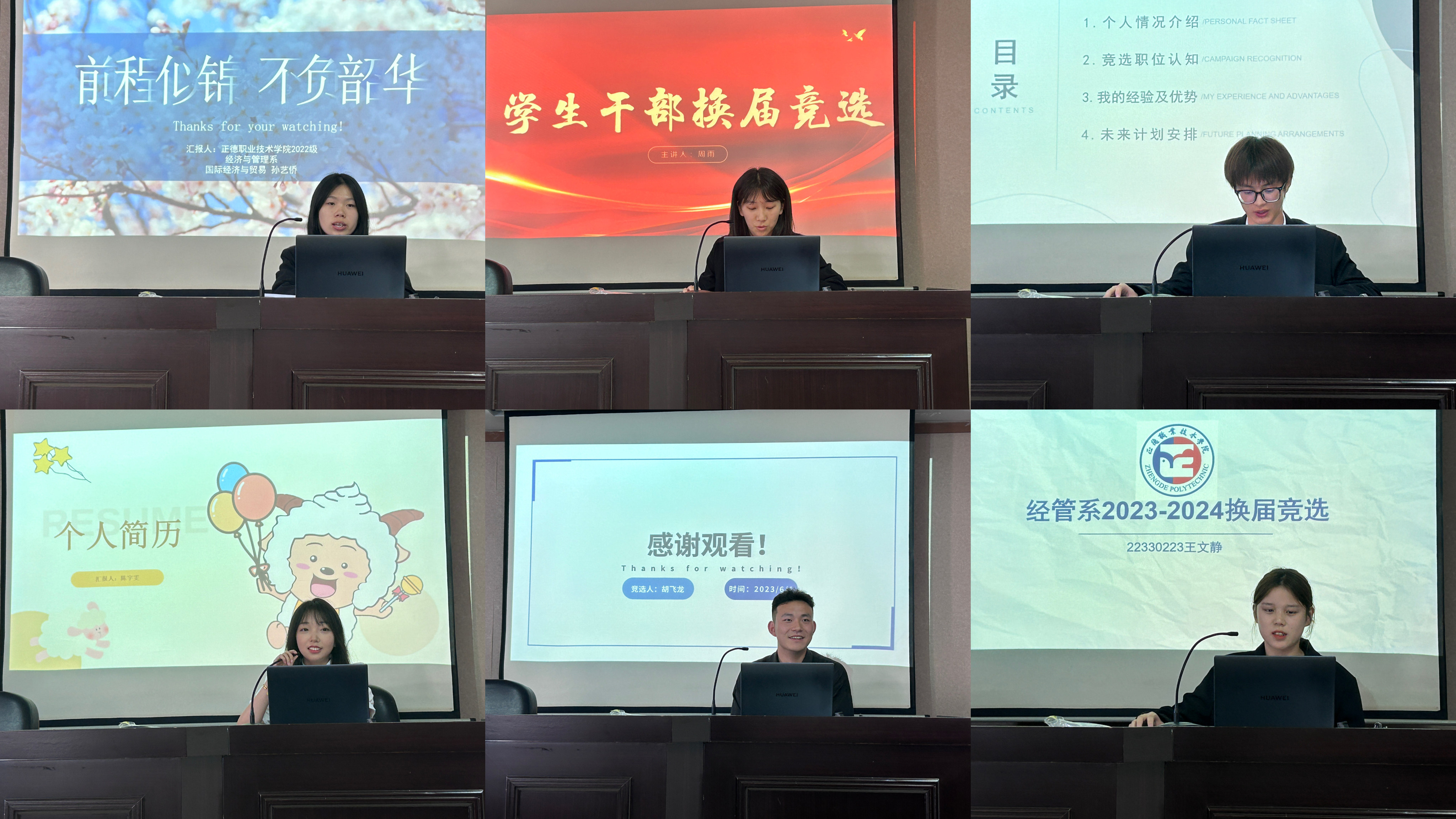 会议的第二部分是换届竞选答辩。答辩开始前,候选人们按照赛前抽签顺序依次上台进行演讲,候选人来自各部门以及辅导员推荐。在竞选过程中,18位候选人自信地走上讲台,以PPT的形式从工作经历、自身优势、未来规划等方面展开演讲。评委仔细听取了候选人的演讲,并针对每位候选人的学生工作经历和对部门未来工作的展望进行提问,候选人从容不迫地回答评委的问题,表现得十分出色。