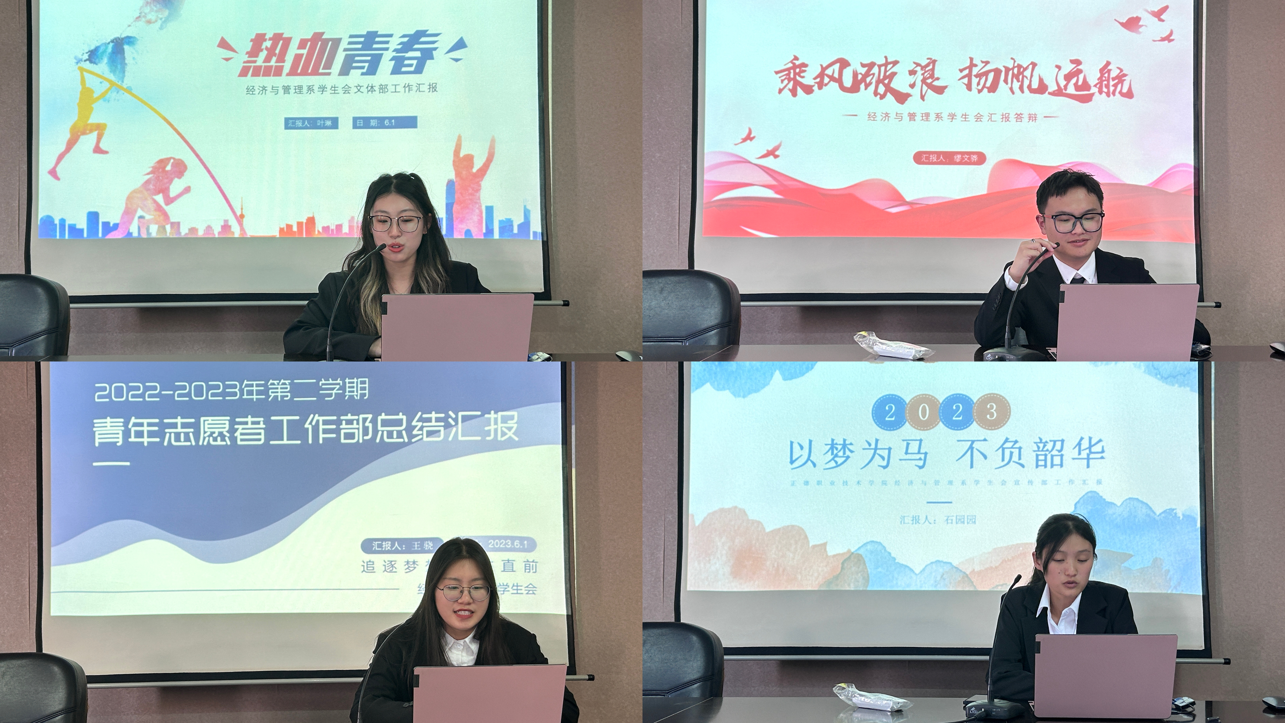 首先,在各部部长述职环节,学生会执行主席缪文骅着重介绍了本学年经管系学生会在加强思想引领、营造健康活跃的校园文化氛围、做好学生权益服务工作等方面服务广大同学的工作成效。接着,各部门负责人依次上台就2022-2023学年的整体工作状况进行汇报,展示了过去一年的耕耘与成就,回顾了工作中无数的迎难而上的故事,展现了部门内家一般的温暖,展望了对未来的期许。