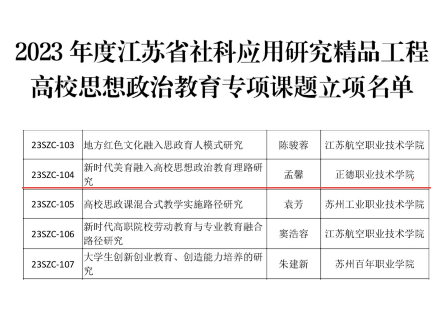 近日,江苏省哲学社会科学界联合会公布了2023年度江苏省社科应用精品工程思想政治教育专项课题立项名单,成人抖音 基础教育系教师孟馨主持申报的《新时代美育融入高校思想政治教育理路研究》获批立项。该课题以“美育课程”为着力点,致力于在课程教学中不断提高学生的审美与人文修养,为推进学院美育教育与实践高质量发展积极贡献力量。