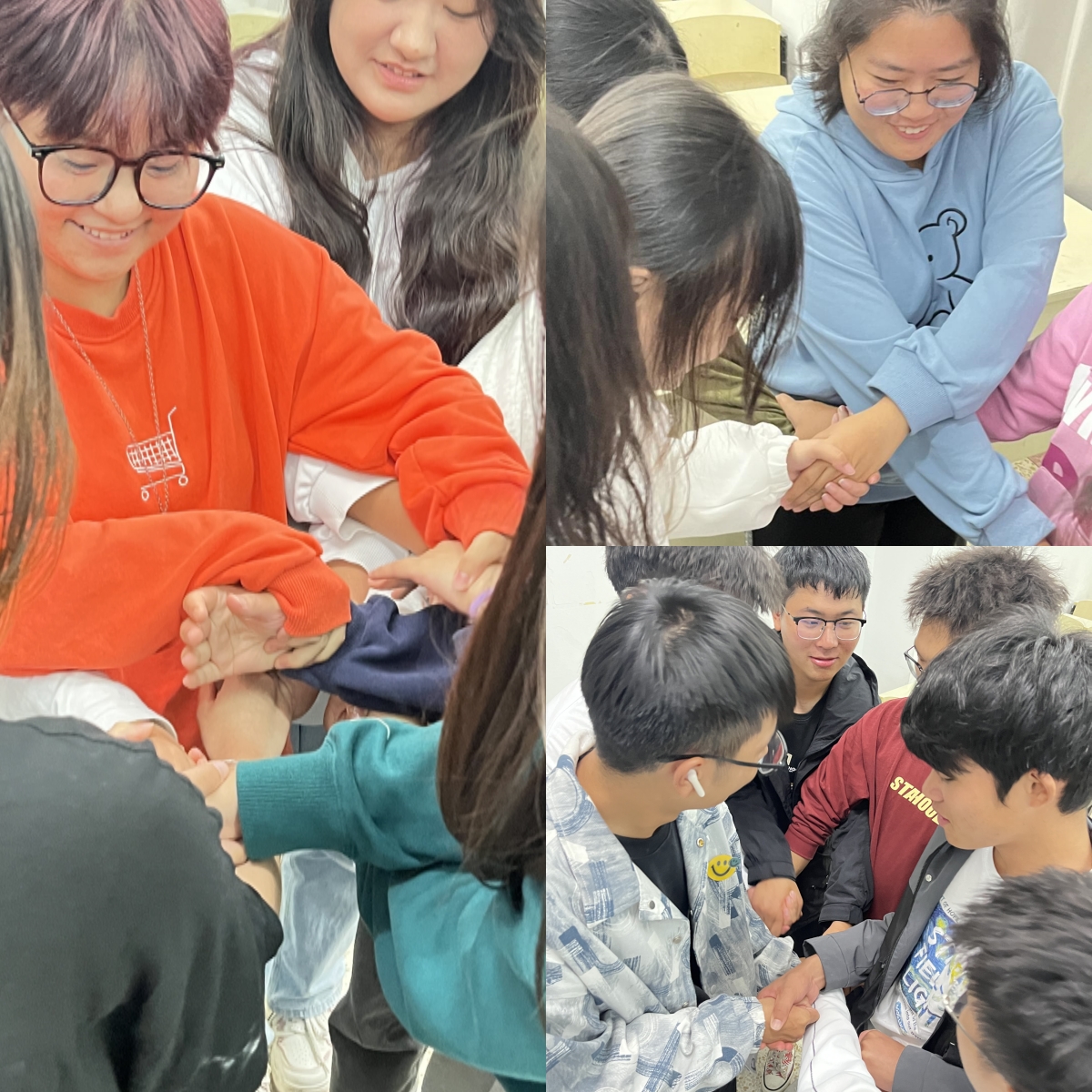 活动环节以“解开千千结”小游戏开始,现场的所有同学六人一组,手牵手围成大圈,主持人站在圈外指挥。每个同学都要记住自己左右两边的人,听到主持人说解散的口令后开始随便相圈内走动,主持人叫停后,大家停止运动并找到刚开始在自己身边的人,保持原地不动,重新牵手。紧接着就是要想尽一切办法恢复到正常的牵手状态。同学们团结协作,用尽一切办法解开结。这个游戏拉近了大家心的距离,促进了彼此之间的熟悉和沟通,增进了相互之间的理解和信任,同时也培养了同学们的组织和协作能力,营造了互助协助的积极氛围。