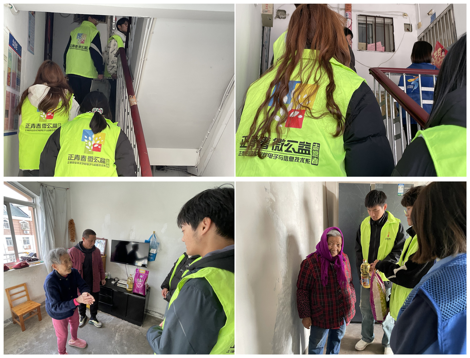 在秣陵街道太平社区工作人员的带领下,电信系志愿者们将系里准备的五常大米、食用油带到社区独居老人的家中,分组走访慰问了辖区内空巢、独居老人,询问他们的生活状况、子女工作情况等,通过陪同老人聊天解闷,及时了解老人的实际需求,为他们提供精神慰籍和心理抚慰并向社区工作人员反馈。