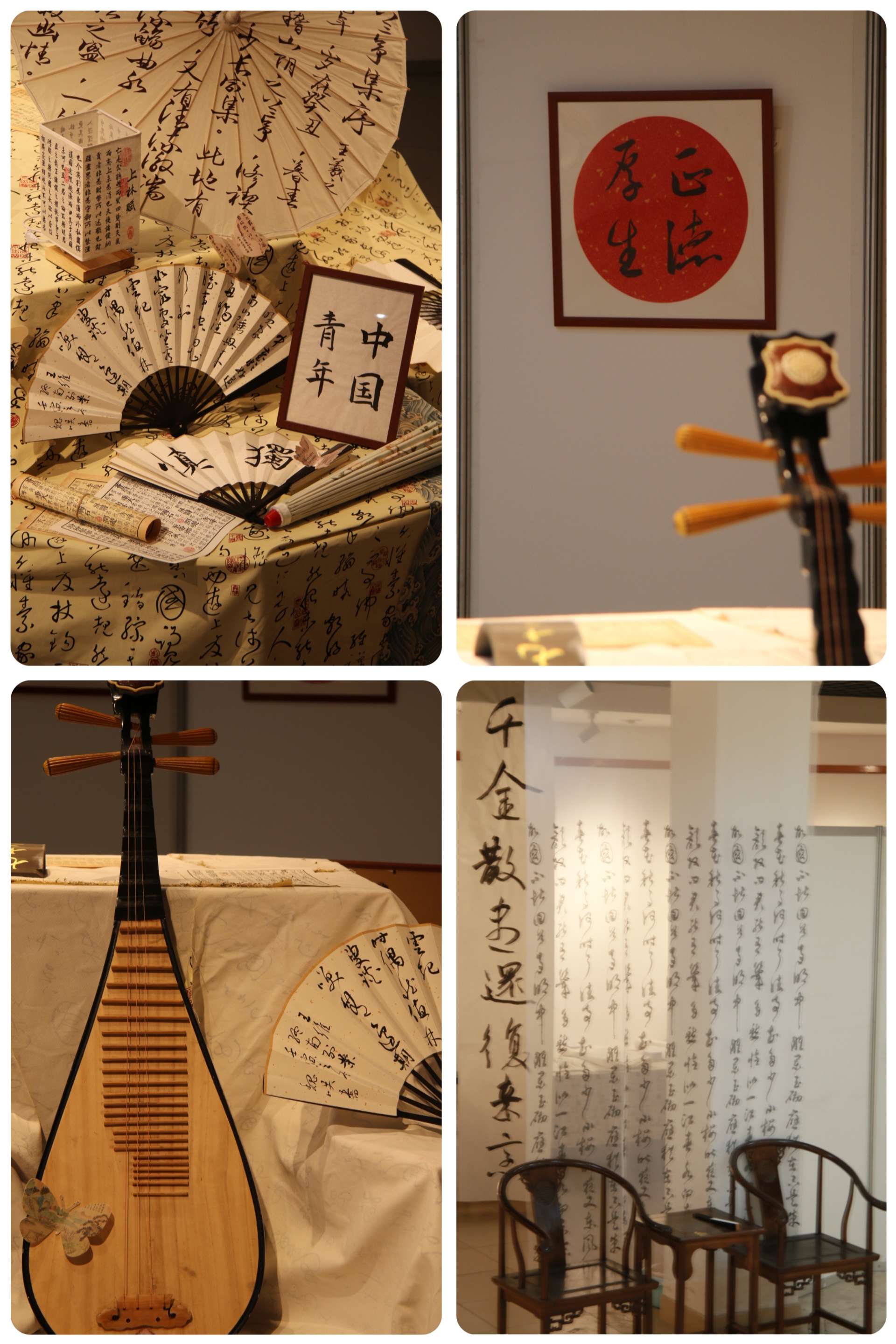 此次的作品展亮点还在于展厅的布置充分利用了艺术设计的专业特点,在专业老师庄黎的指导下,校内的一片片落叶、一根枯树枝、一个瓦片与中国的传统文化元素古琴、茶艺、画扇相融入至整个展厅设计中。