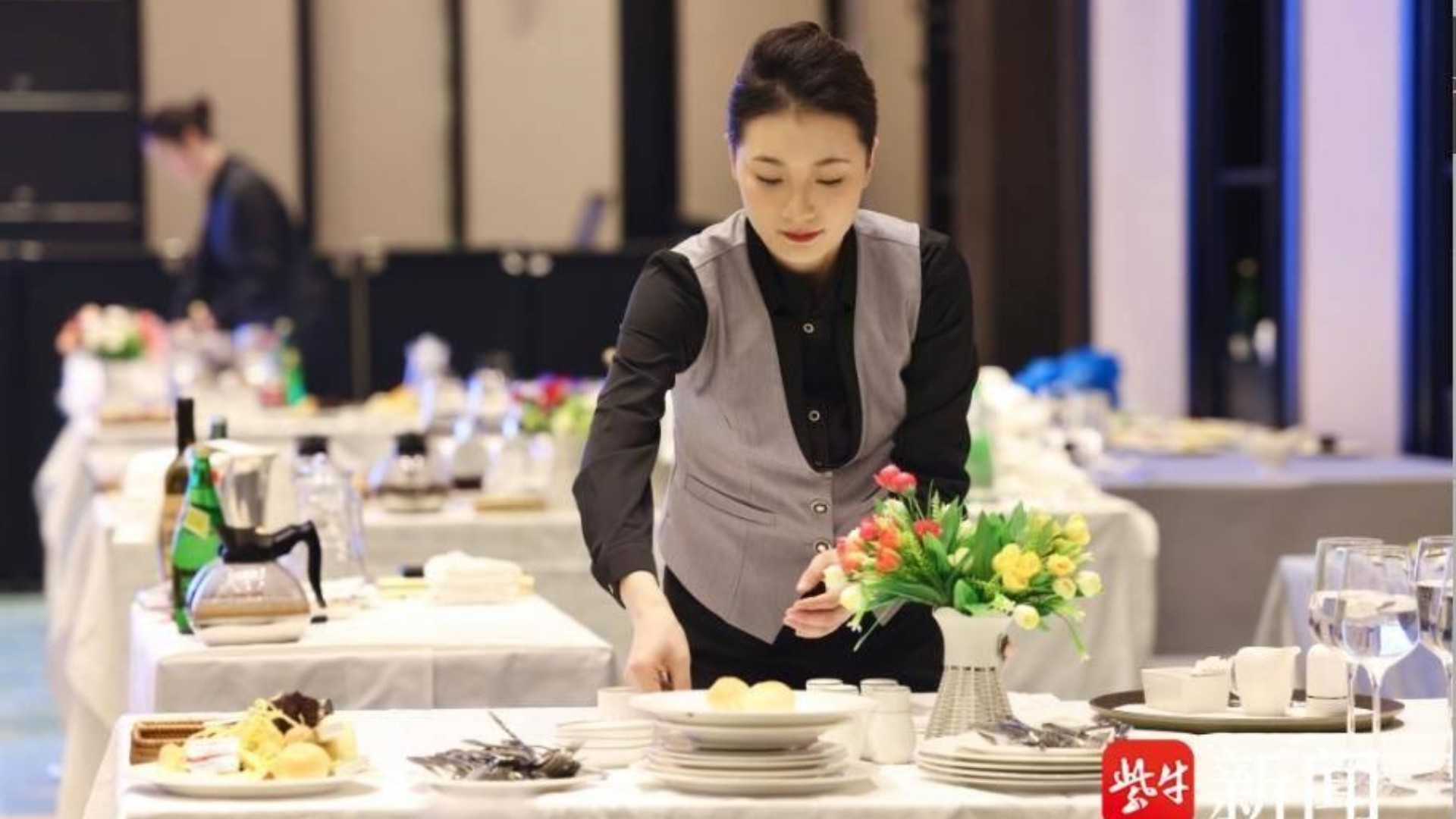 “酒店服务”赛项共分前厅接待、中餐服务、西餐服务三个模块。其中前厅接待为入住登记、退房离店、投诉或突发事件处理三大内容;中餐服务为主题宴会设计、宴会服务两大内容;西餐服务为休闲餐厅服务内容,充分考查酒店管理与数字化运营专业学生的核心技能和相关岗位职业素养。最终,成人抖音 选手凭借扎实的基本功、出色的现场表现完成了赛项各项任务,赢得了评委们的认可。
