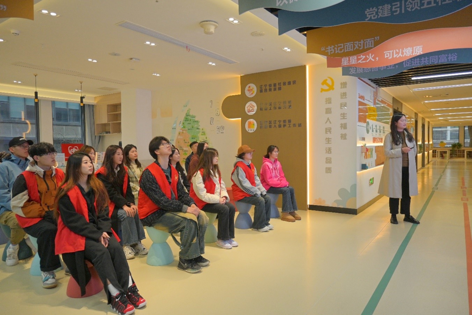 看一回服务驿站。座谈会后,志愿者们在社区工作人员的带领下参观了江宁街道便民服务大厅及流动团员服务驿站。参观过程中,志愿者们纷纷表示,便民服务大厅的高效运作和流动团员服务驿站的细致服务,都体现了社区对居民需求的深度理解和精准回应。志愿者们被工作人员和街道流动团员们的敬业精神和无私奉献所感动,也为自己能参与到这样的志愿服务中而感到骄傲和自豪。他们纷纷表示,要将这种服务精神带回学校,传递给更多的同学,让更多的人参与到社区服务的行列中来,共同为构建更加和谐美好的社区贡献力量。