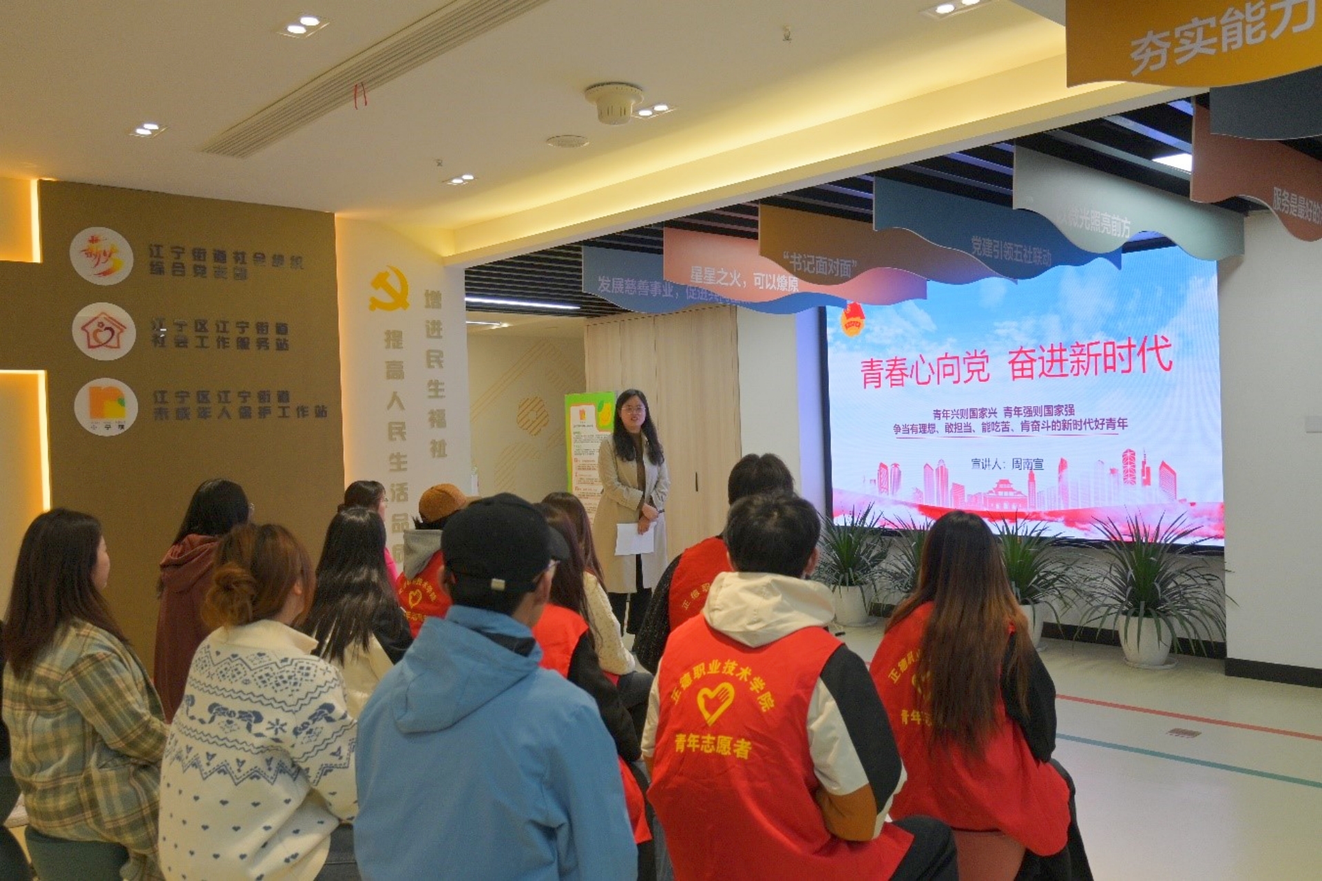 听一堂青春宣讲。参观完毕后,便民中心党支部的青年党员们为志愿者们呈现了一场深入人心的宣讲。他们以“青春心向党 奋进新时代”为主题,用生动的语言、鲜活的事例,讲述了党的光辉历程和伟大成就。宣讲中,党员们深情地分享了他们在党的引领下,如何践行青春理想、勇担时代使命的故事,激励着每一位在场的志愿者。志愿者们听得聚精会神,深受启发。他们纷纷表示,要将这次宣讲精神内化于心、外化于行,以更加饱满的热情投身到志愿服务中去,用实际行动践行青春誓言,为新时代的发展贡献自己的力量。