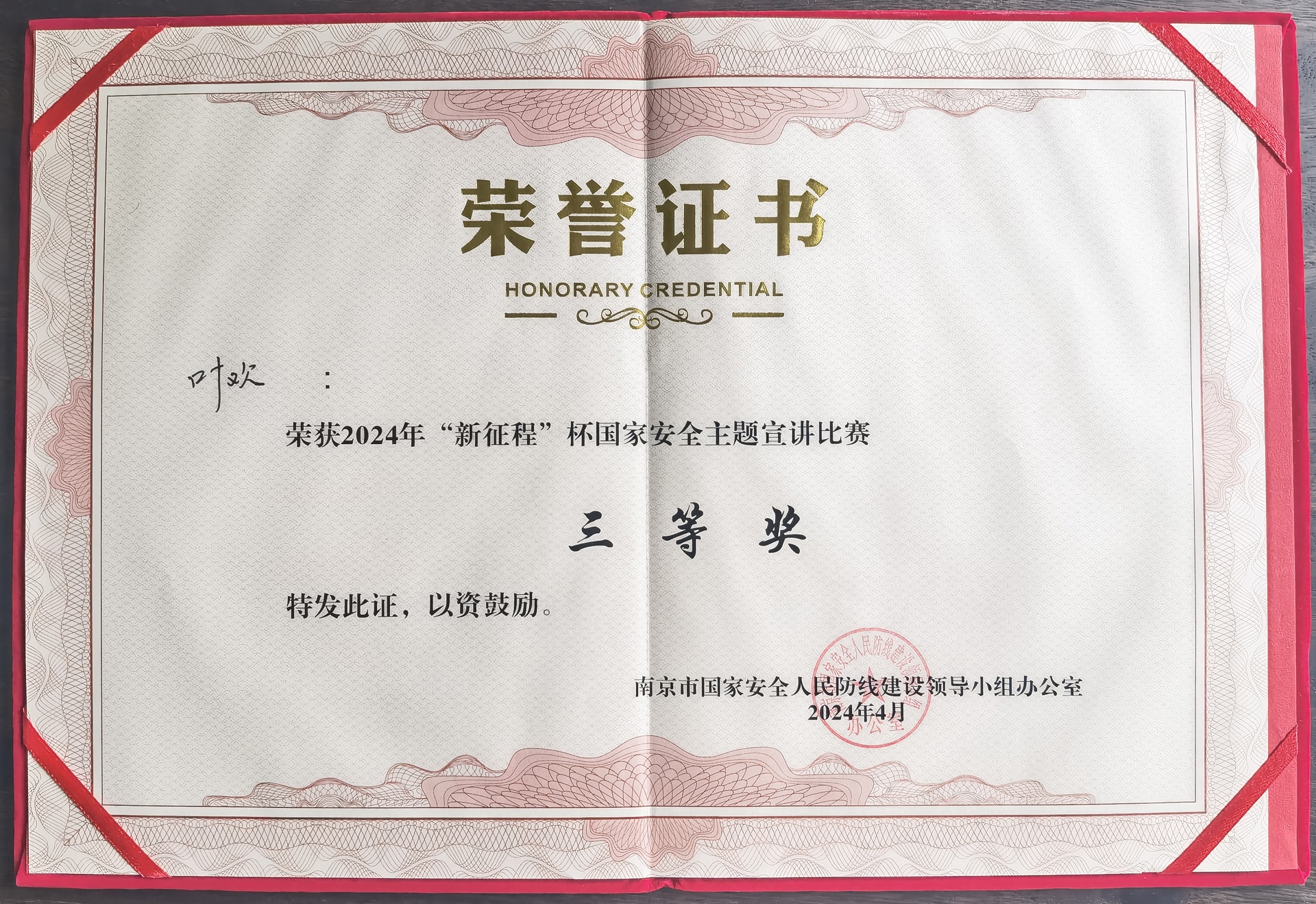 本次宣讲赛共有30所在宁高校参与,设一等奖1名,二等奖3名,三等奖5名。经过一个月的备赛,叶欢老师在各校选手的激烈角逐中突破挑战,最终荣获三等奖,为学院争得了荣誉,同时也展示了思政教研部的强大凝聚力。在国家安全日即将到来之时,思政教研部将继续加强国家安全理论的宣教工作,引导师生牢固树立总体国家安全观。