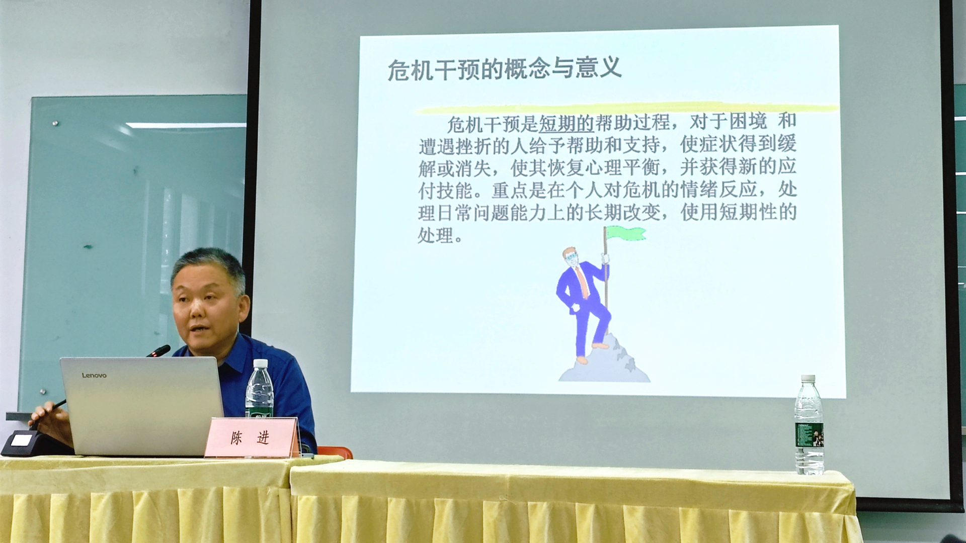 此次培训由中国心理卫生协会危机干预专业委员会副主任委员、江苏省突发性公共卫生事件危机干预专家库成员、南京医科大学附属脑科医院陈进主任担任主讲。陈主任长期负责江苏省心理危机干预热线以及南京危机干预中心工作,具备着极为丰富的临床工作经验。