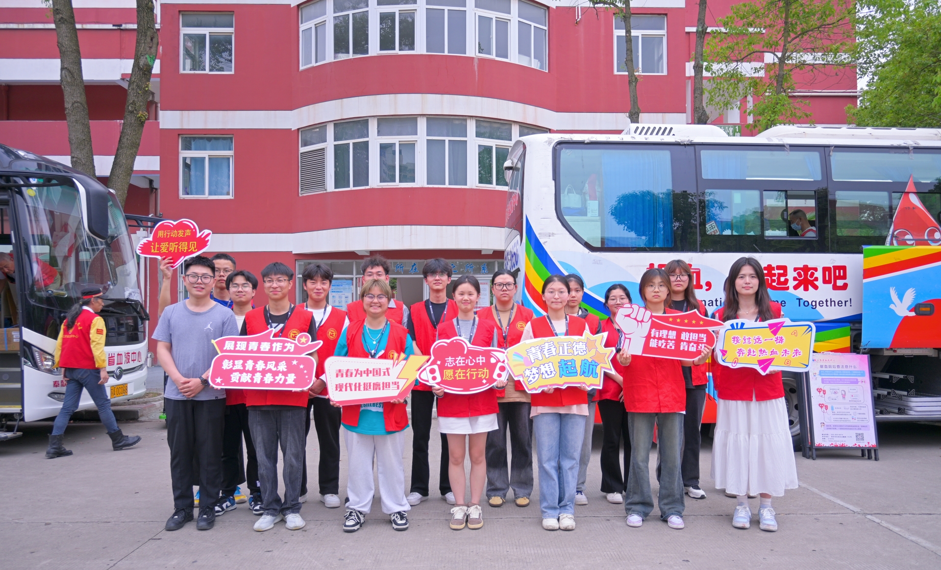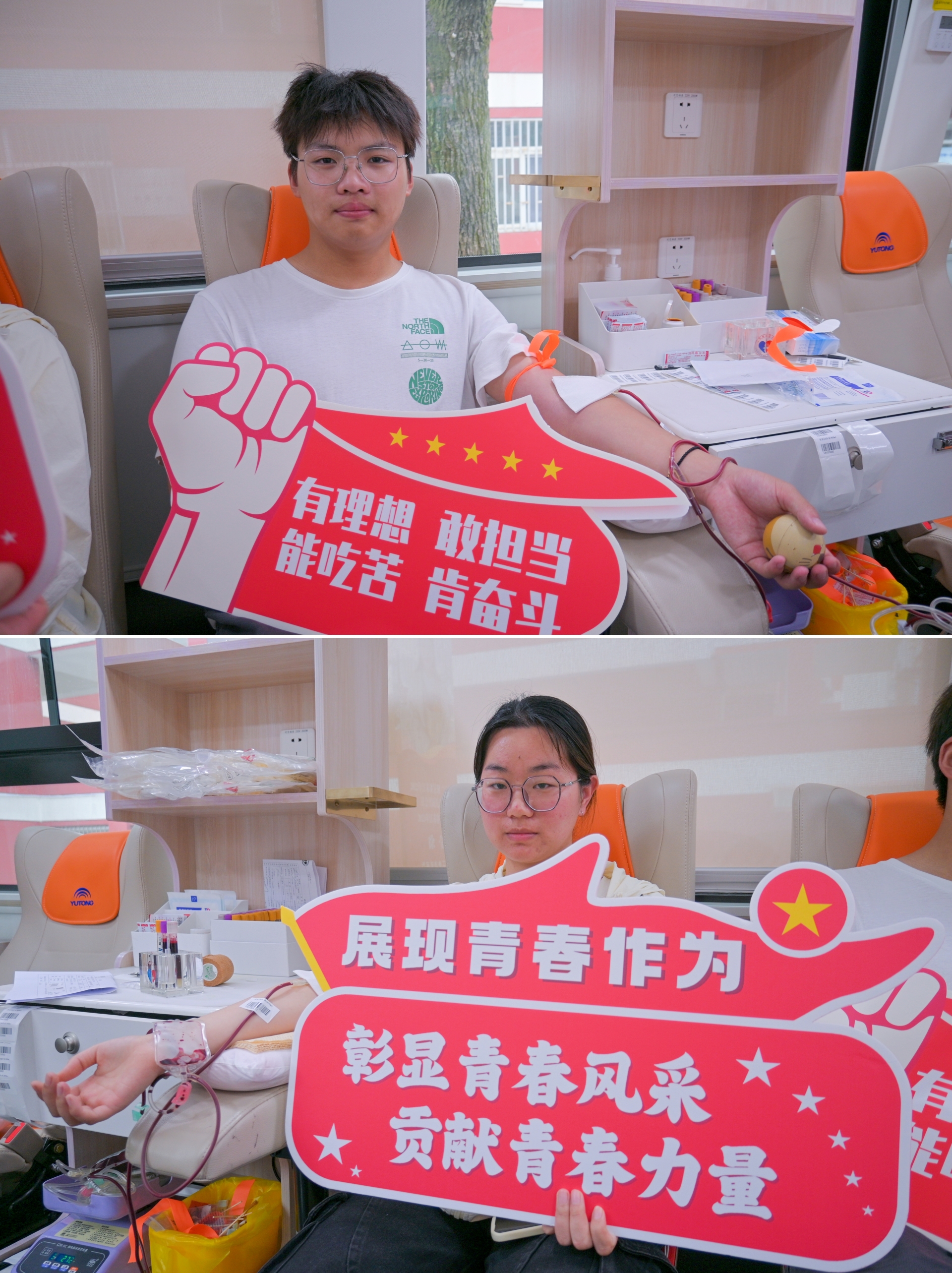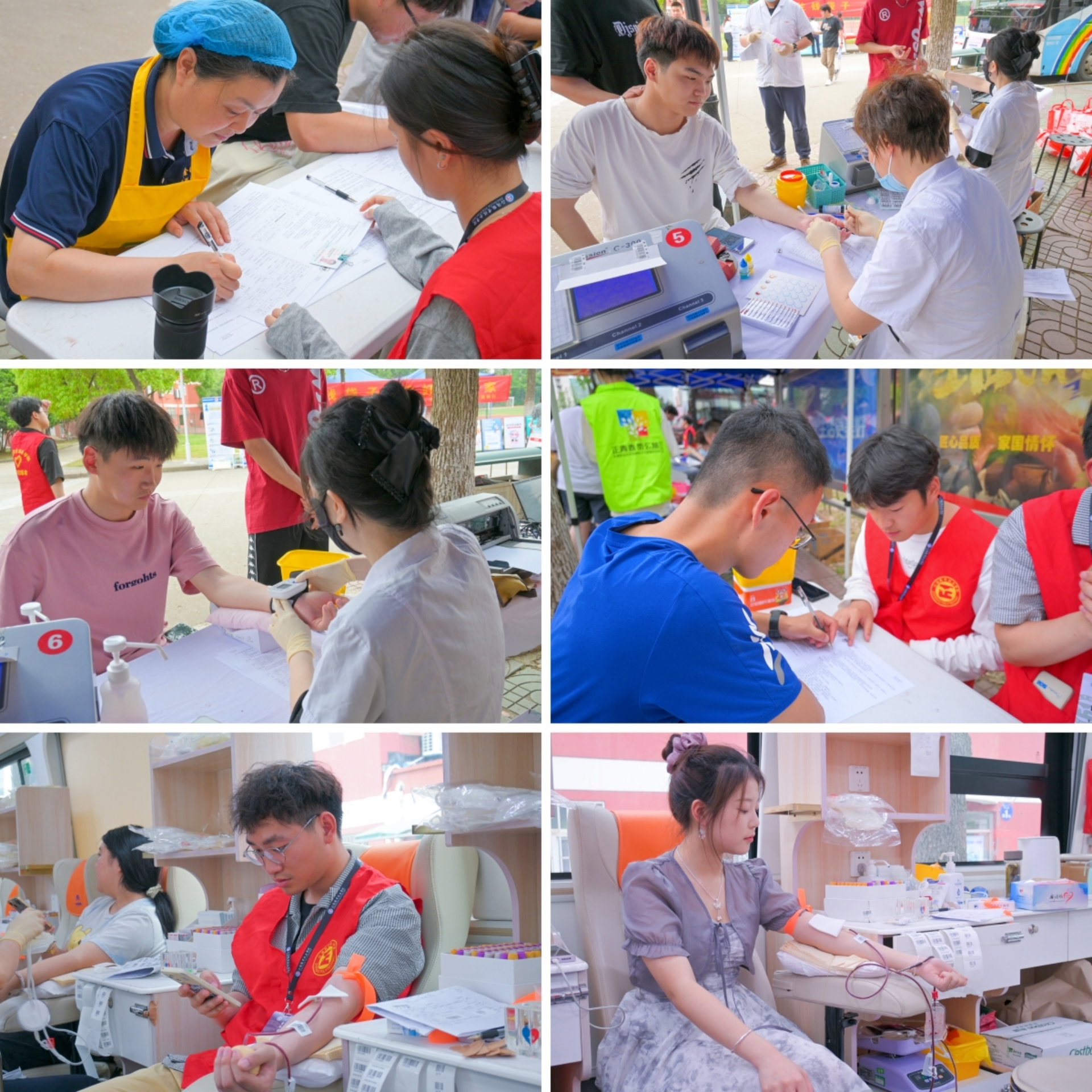 采血现场,同学们精神饱满、热情高涨。他们在青年志愿者与血站工作人员的指导下,依次完成信息登记、血压测量、血液检测等流程,待血液检测合格后,便开始血液采集。在献血车上师生们逐一伸出手臂,一个个露出欣喜的笑容,他们互相鼓励,互相帮助,互相关爱,全力配合医护人员。“人生就该有这样一次经历,让我们一起用血液去汇聚爱!”“我已经不是第一次献血了,能帮助别人挺好的!”“我们年轻又强壮,为社会献出一份爱心,这是青年大学生的责任和义务。”“给组织活动的志愿者和医生加油点赞!”献完血的同学们在休息时这样热议着。