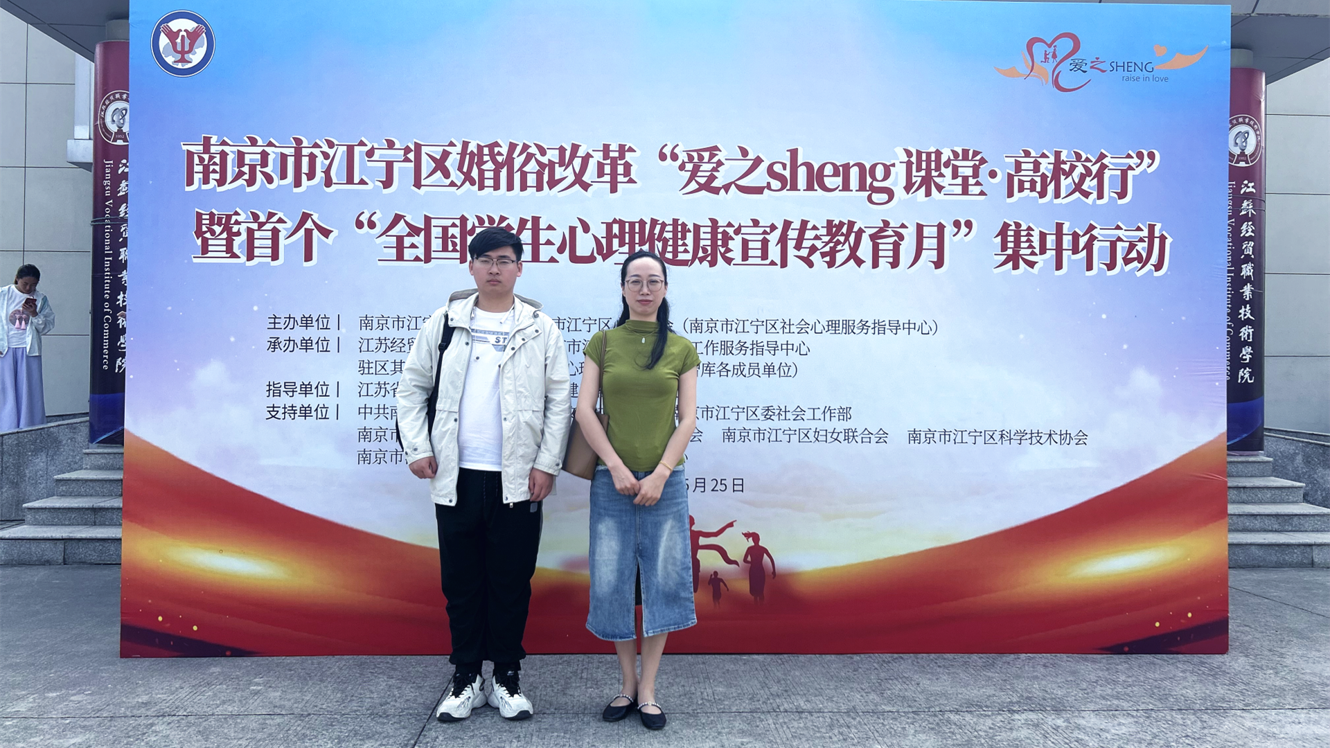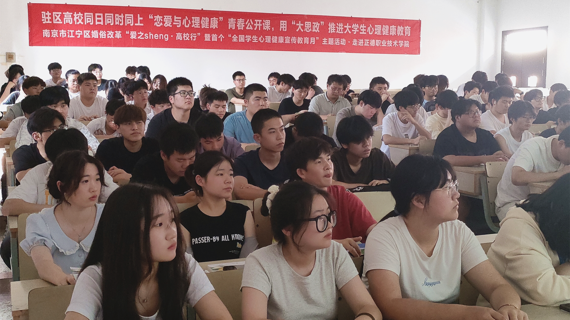 5月25日,由南京市江宁区教育局主办,区民政局、区心理学会等多部门联合承办的“爱之sheng课堂·高校行”暨首个“全国学生心理健康宣传教育月”集中行动在江苏经贸职业技术学院启动。江宁驻区27所高校21个分会场、2500余名师生,通过直播平台,线上线下同上“恋爱与心理健康”青春公开课。成人抖音 学生处傅蕴男老师和心理社团陈龙翼同学参加了主会场活动,120名学生在学院1303教室分会场观摩活动。