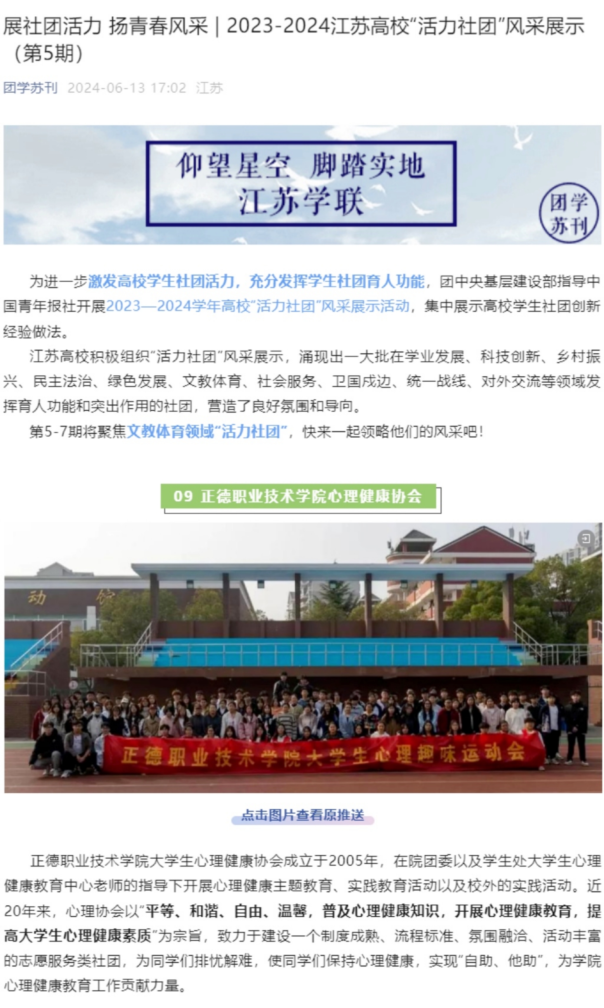 为进一步激发高校学生社团活力,充分发挥学生社团育人功能,团中央基层建设部指导中国青年报社开展2023—2024 学年高校“活力社团”风采展示活动,集中展示高校学生社团创新经验做法。经院内选树、省级展示等环节,成人抖音 心理健康协会社团获评2023-2024江苏高校“活力社团”荣誉称号!
